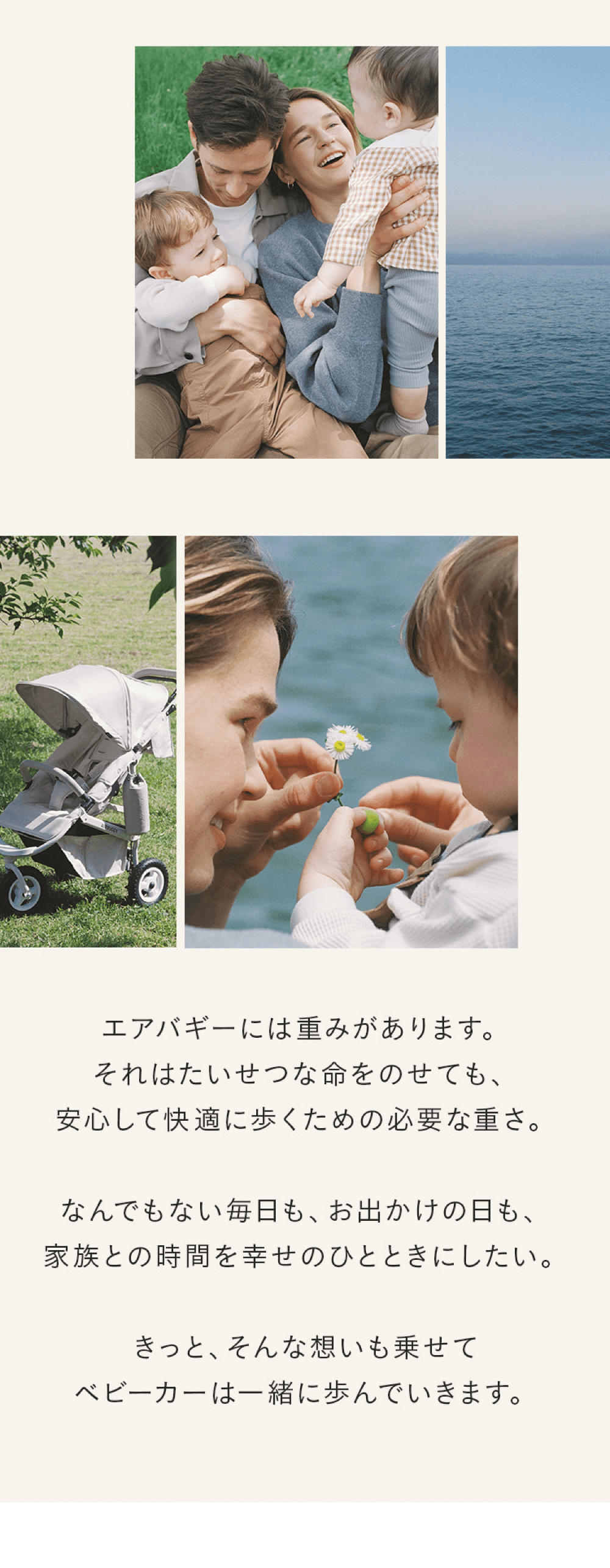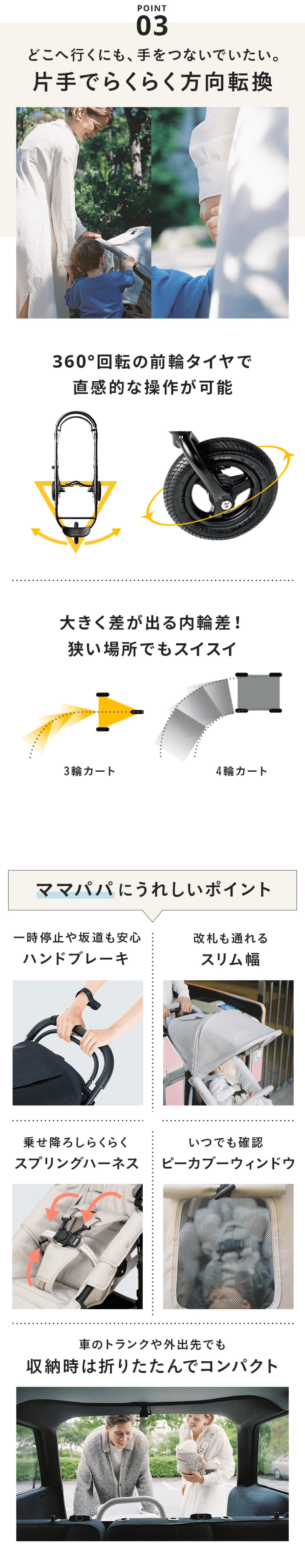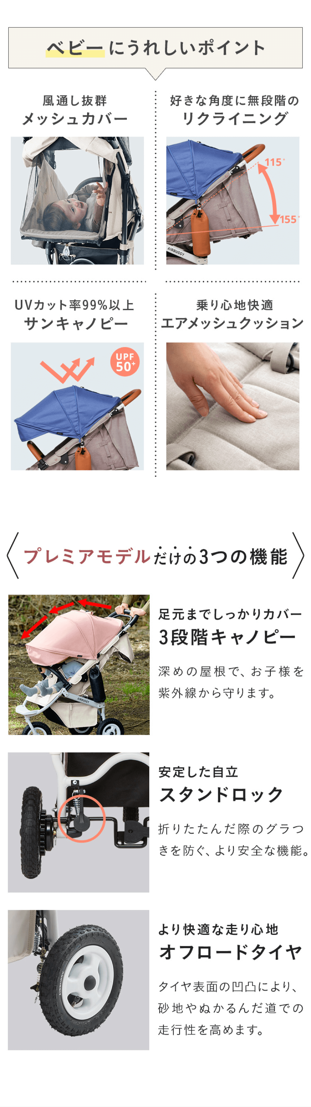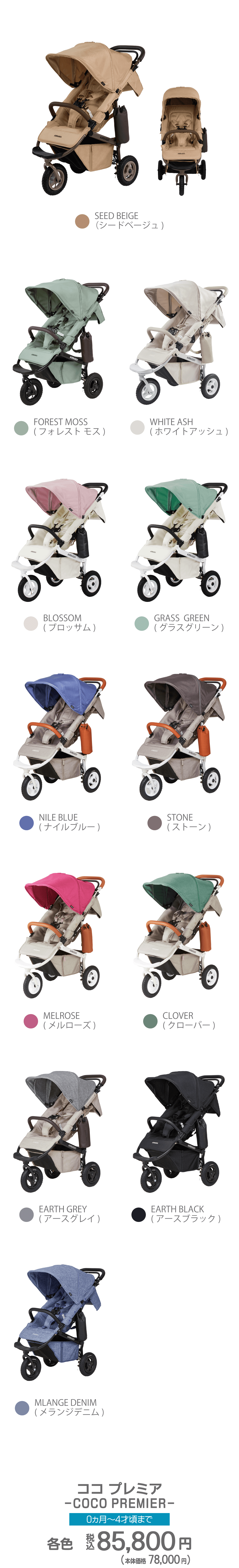 UVカット率99%以上(UPF50+)、3段階に調整できる深めのサンキャノピーやオフロードタイヤ、スタンドロックなど、ワンクラス上の機能をプラスしたCOCO PREMIERフロムバース。