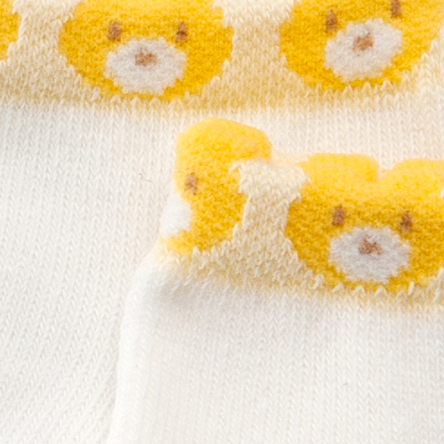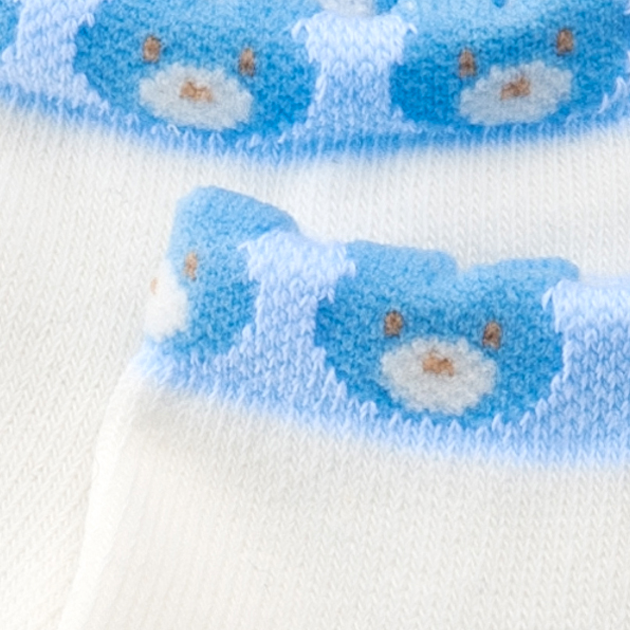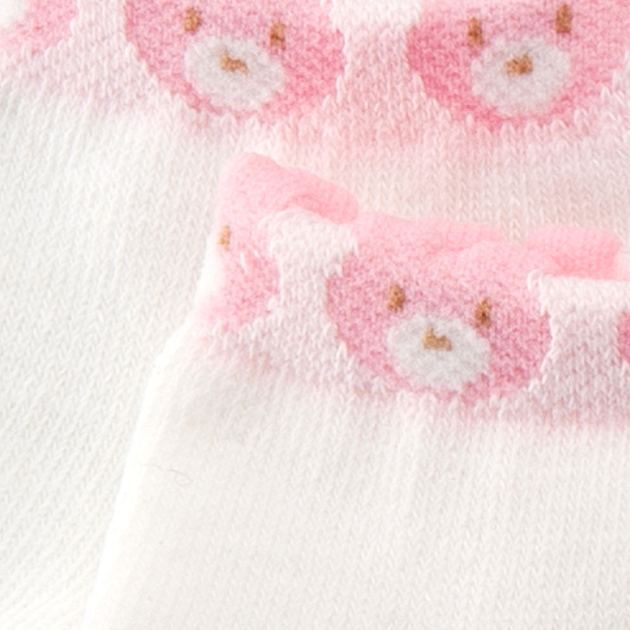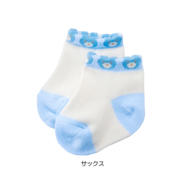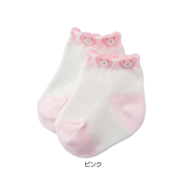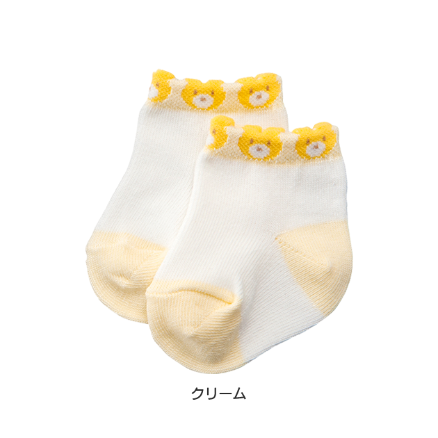 足首にくまさんの顔が並んだかわいらしいデザインのソックスです。3色展開しているので、お気に入りの色を探してみてください。伸縮性のある生地で赤ちゃんの脚をやさしく包みます。ご自宅用はもちろん、ちょっとしたプレゼントとしてもおすすめの商品です。 素材 綿・アクリル・ナイロン・ポリウレタン サイズ・寸法 7〜8cm