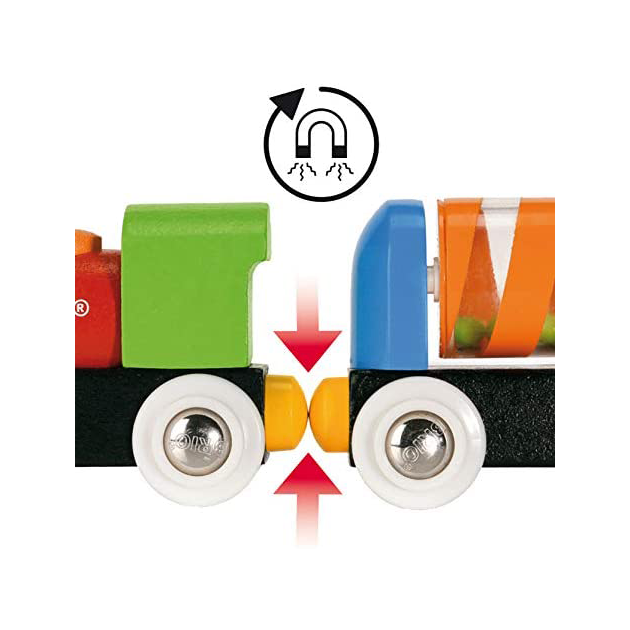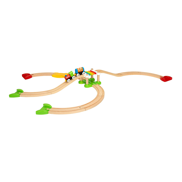 1歳半からの新しいレールウエイセット。充実したセットでレール遊びをより楽しむ ことができます。カラフルな列車でレインボー カラーの橋を渡ったりくぐったり、お好きな レイアウトにしてお楽しみください。対象年令:1.5才から