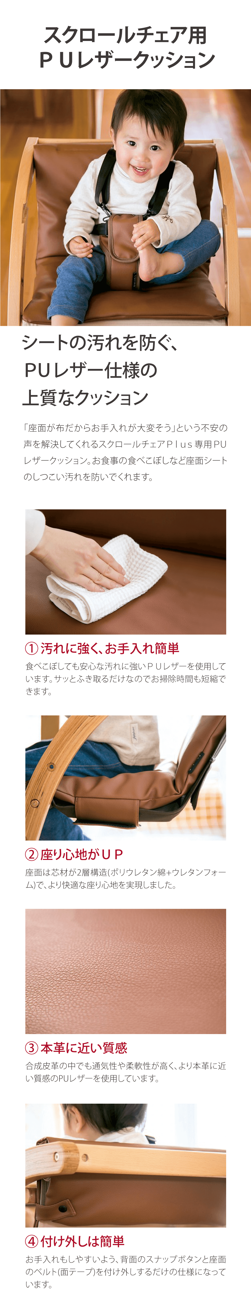 お食事などの汚れからシートを守るお手入れ簡単なPUレザー仕様のクッション。