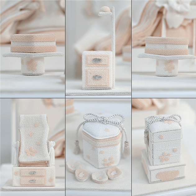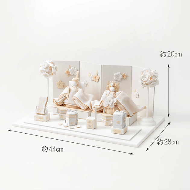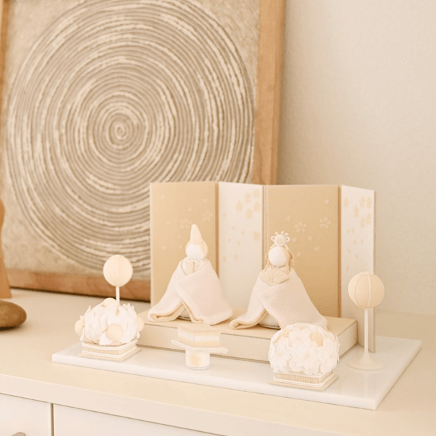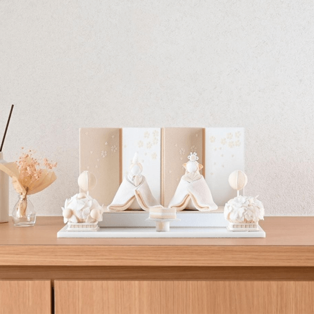 女の子の健やかな成長を願う桃の節句、従来の色鮮やかな雛人形とはちょっと趣向を変えて、親王(お雛様とお内裏様)だけでなく、お道具や屏風、ぼんぼりなど全てを白とベージュでシンプルに仕上げました。
