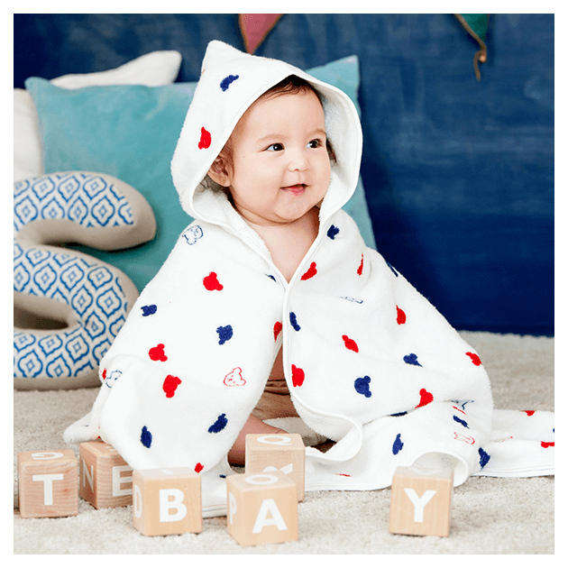 吸水性に優れた無撚糸タオルはふんわりとやわらかな肌触りでデリケートな赤ちゃんの肌をやさしく包みます。
