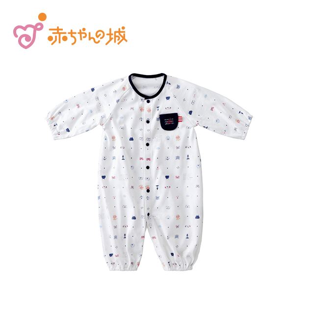 生まれてすぐは足を包むドレスタイプ。足をばたばた出来るようになったらボタンを留め替えて、カバーオールタイプにもなるツーウェイ仕様です。