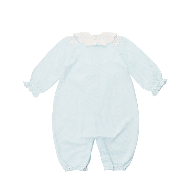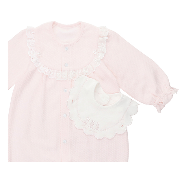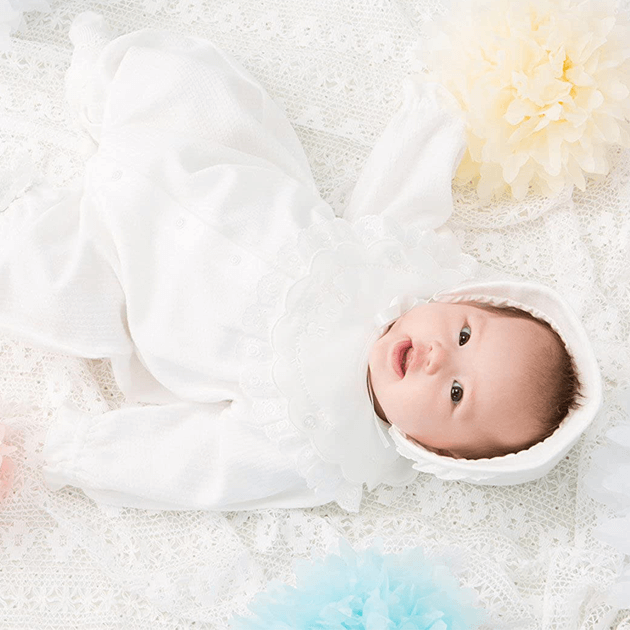 生まれてすぐは足を包むドレスタイプ。足をばたばた出来るようになったらボタンを留め替えて、カバーオールタイプにもなるツーウェイ仕様です。胸元の美しいデザインは写真映えも良く、イベント事やお披露目にも最適です。出産準備はもちろん、ギフトにもおすすめです。素材感のあるジャカード生地に可愛いウサギの刺繍のスタイ、胸元のレースが豪華なドレスです。スタイは取り外し可能で機能的なデザインです。スーピマ綿を使用して生地に編柄を入れたジャカード素材は、秋から春先まで活躍します。