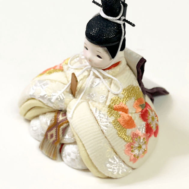 お揃いの刺繍を施した着物のお内裏様。バニラ色の高岡塗の螺鈿屏風がとても品よく、可愛らしい五人飾りです。