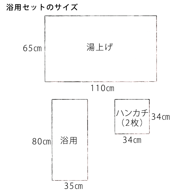 サイズ:湯上げ約65×110cm・浴用約35×80cm・ハンカチ約34×34cm