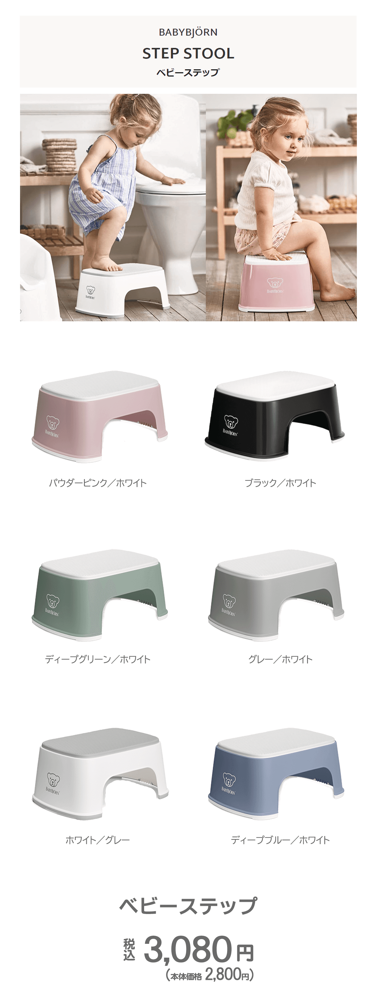 シンプルだけど大活躍 ステップ!お子さまにとって大人の空間はいつも高いところにあります。トイレ、洗面台、台所でもステップがあればもう大丈夫。トイレにすわることも手を洗うことも自分ひとりでできます。