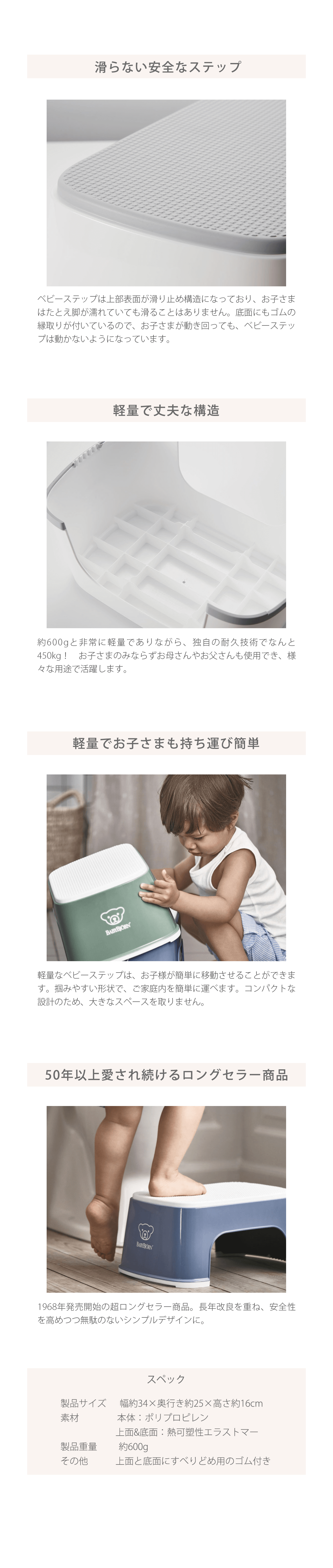 ベビーステップは上部表面が滑り止め構造になっており、お子 さまはたとえ脚が濡れていても滑ることはありません。底面にも ゴムの縁取りが付いているので、お子さまが動き回っても、 ベビーステップは動かないようになっています。