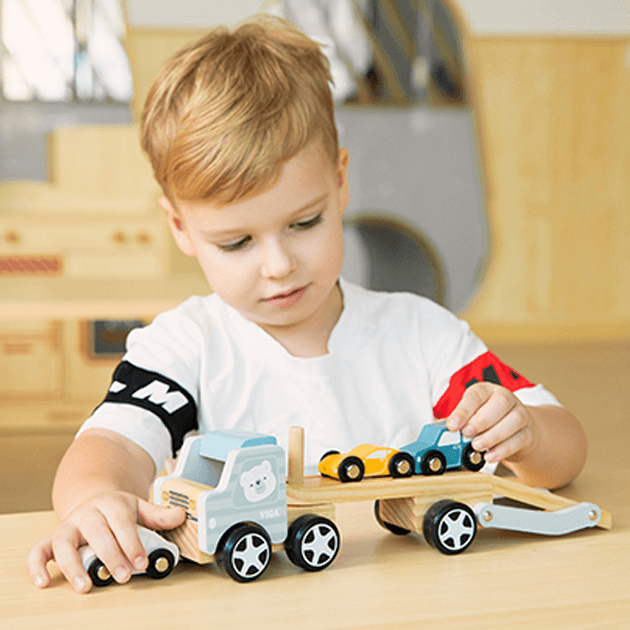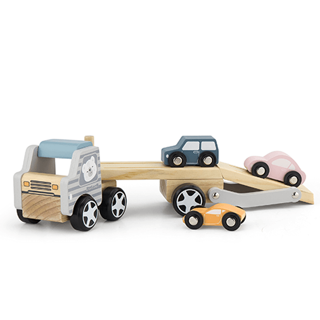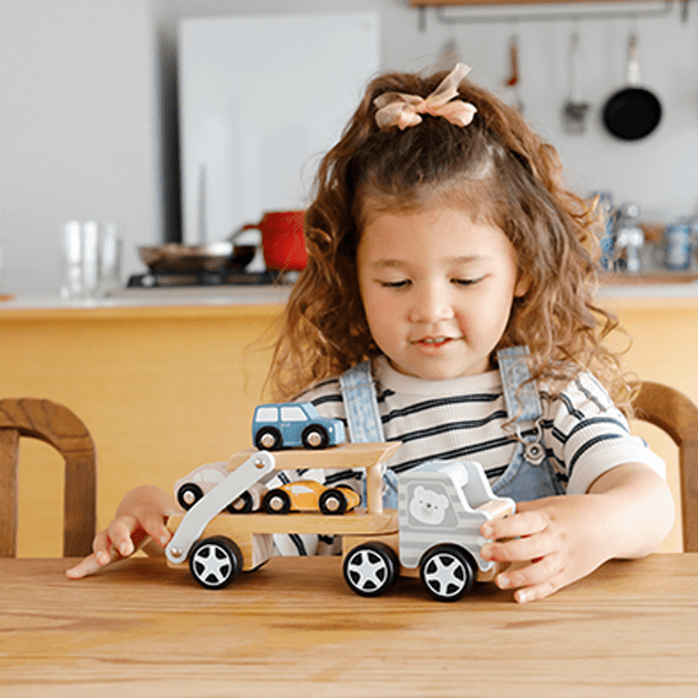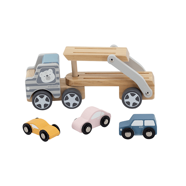 北欧テイストをベースにしたペールトーンカラーの木製玩具ブランドPolarB(ポーラービー)から、新しく乗り物のおもちゃシリーズが登場!やさしいペールトーンカラーの3台の車が付属する2階建てのキャリアカー。荷台を動かして車を積み込んだり、スロープにして車を下ろしたり。機能や仕組みを理解し、工夫することや想像性を養うきっかけにもなるおもちゃです。