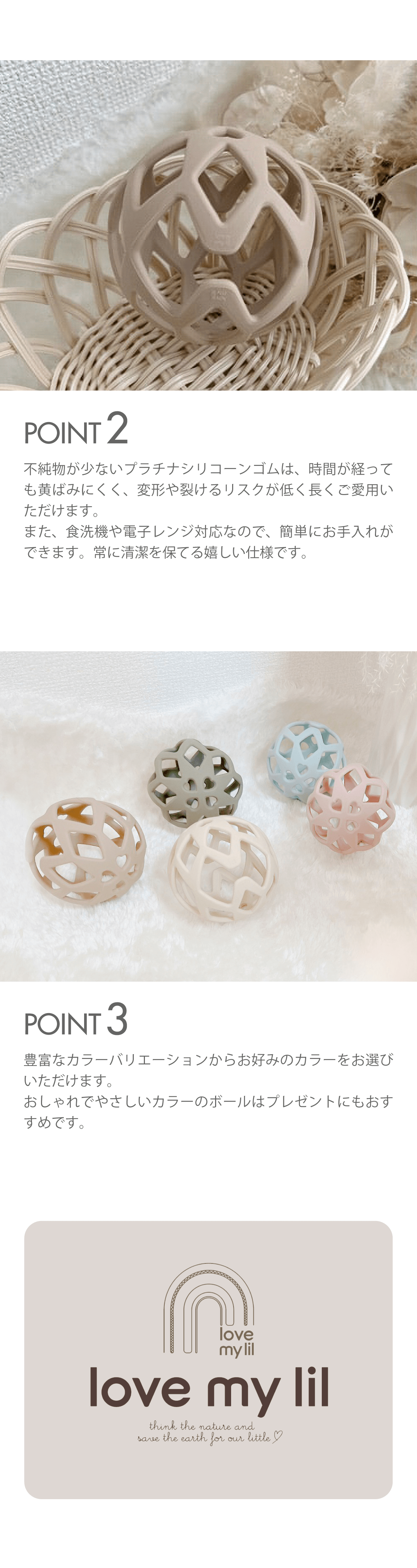 ・小さな手でも握りやすく掴みやすい形状の柔らかなシリコーン製のボール。こだわりの設計で赤ちゃんが夢中になること間違いなし。ファーストトイにも最適です。
