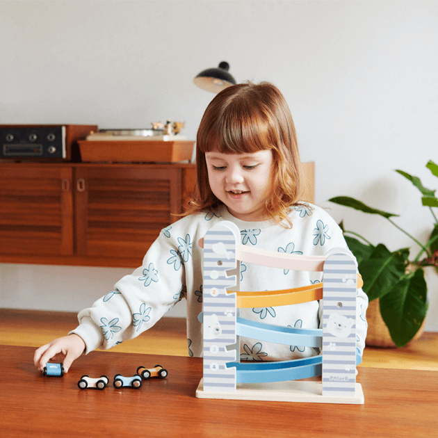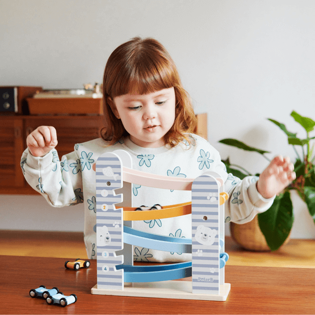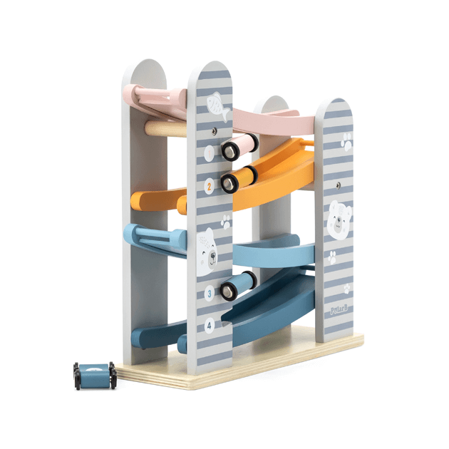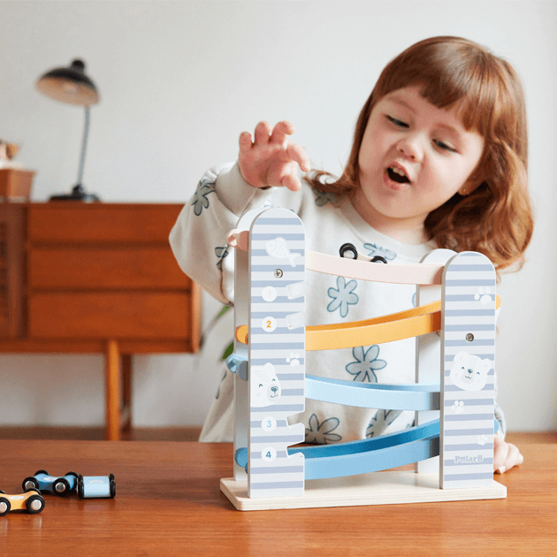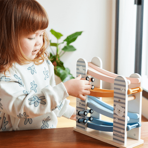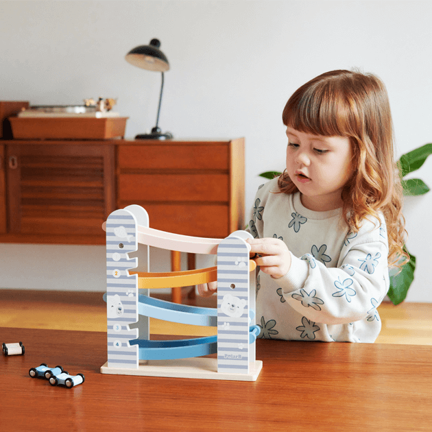 カラフルな滑り台と車4台がセットのカースライダー。