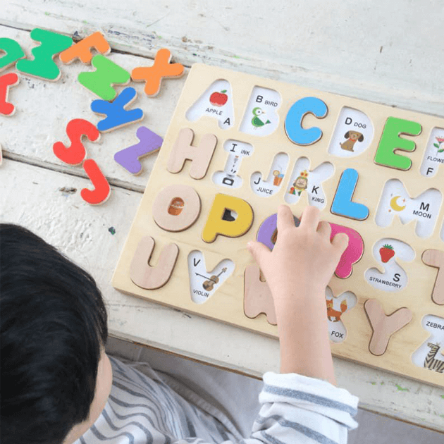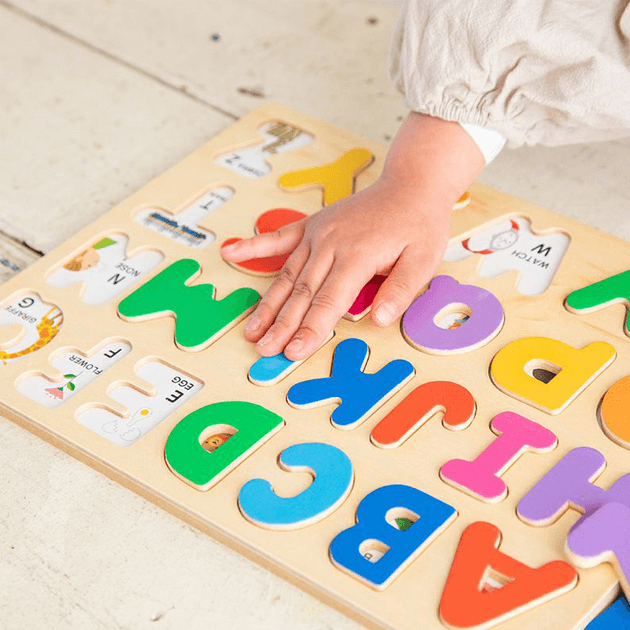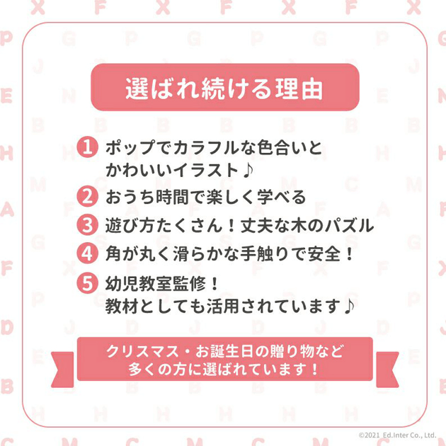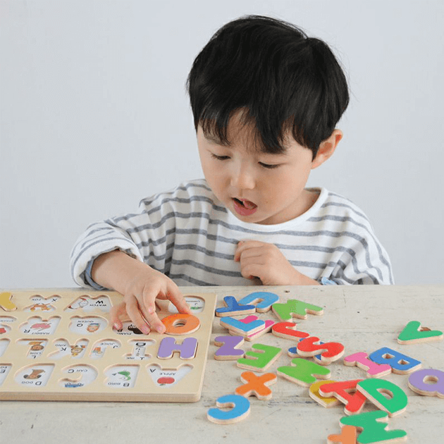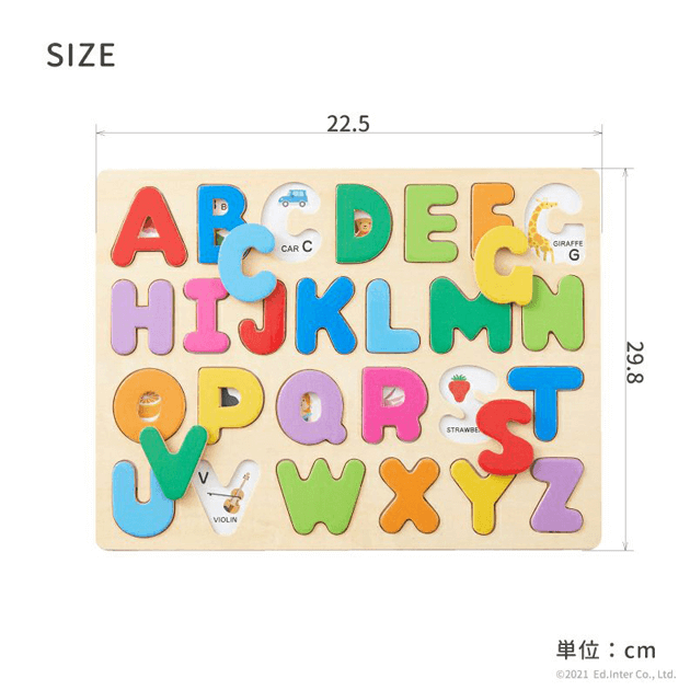 【3歳お誕生日プレゼント♪】カラフルで見た目もかわいい、温かみのある木のアルファベットパズル。繰り返しアルファベットをはめ込み、手で形を確認することで「アルファベット」が自然と頭に入ってきます。ピースをめくると関連するイラストが描かれているので、英単語や色を遊びながら覚えることができます。■セット内容:ボード×1、パズルピース×26■対象年齢:3歳以上