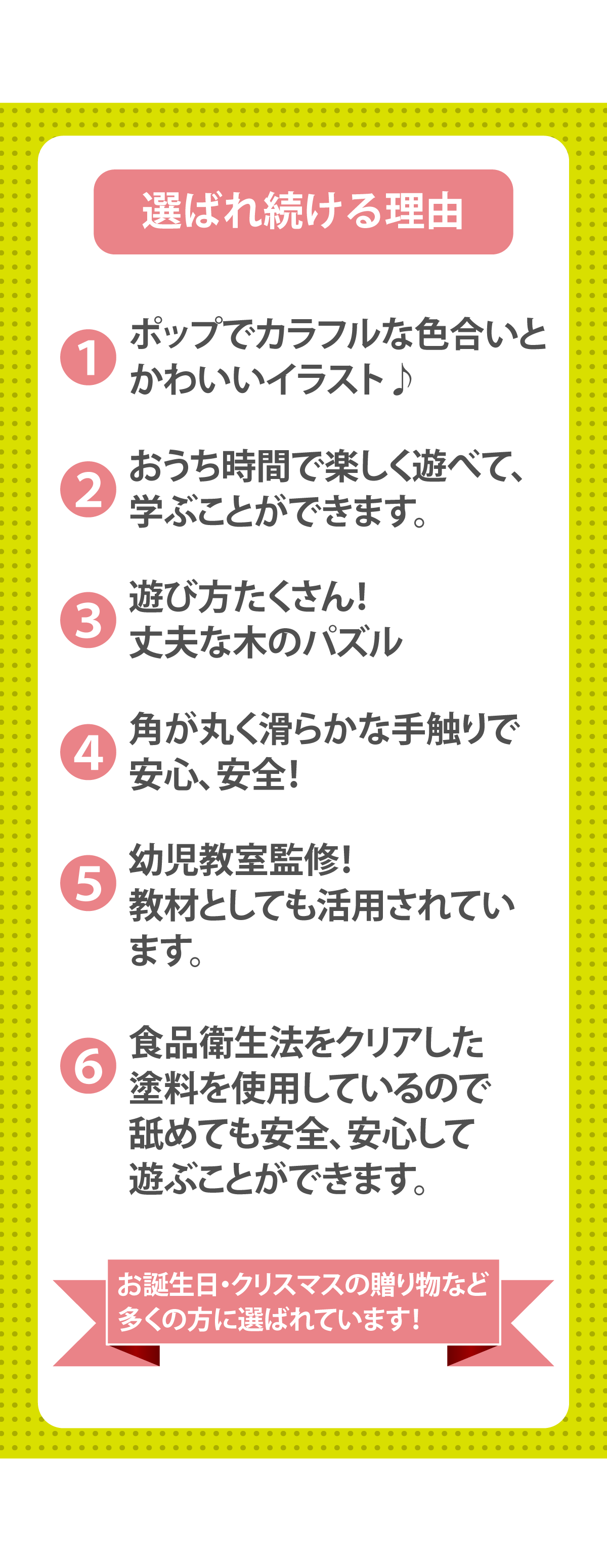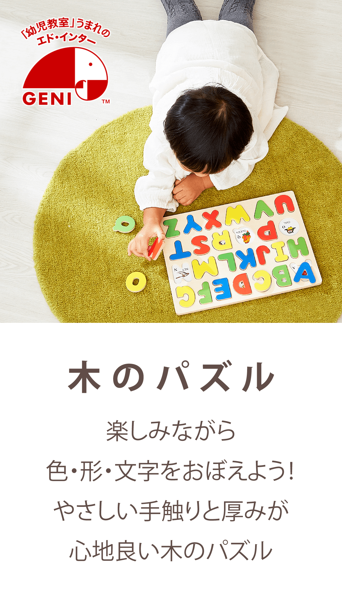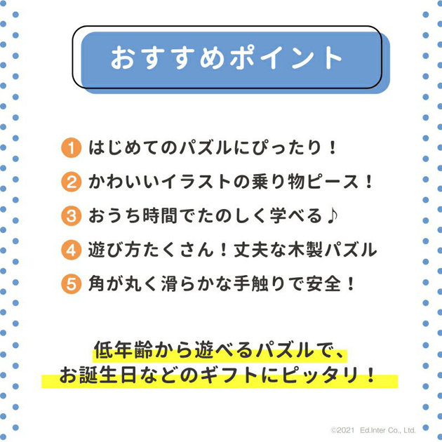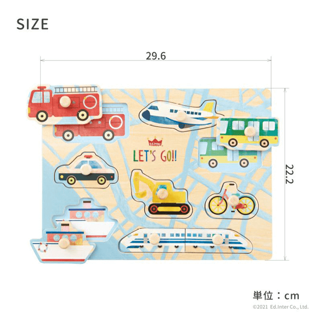 【お誕生日プレゼントに♪】 人気の乗り物8種類を集めた木のパズル。大きいペグ(取っ手)付きなので、低年齢から楽しく遊べます。乗り物のピースをめくると下に同じ絵が描かれているので、絵を合わてはめ込むパズルを楽しめます。頭や指 先を使う事で、子どもの考える力や創造力をぐんぐん伸ばします。 ■セット内容:ボード×1、パズルピース×9■対象年齢:1.5歳以上