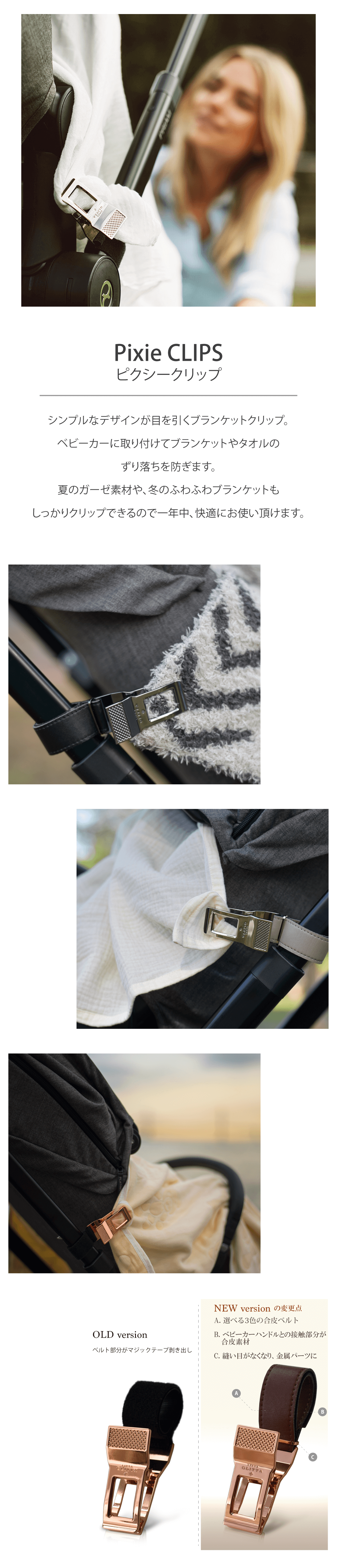 PIXIE CLIPS(ピクシークリップ)シンプルなデザインが目を引くブランケットクリップ。ベビーカーに取り付けてブランケットやタオルのずり落ちを防ぎます。夏のガーゼ素材や、冬のふわふわブランケットもしっかりクリップできるので一年中、快適にお使い頂けます。■製品仕様本体寸法:W 3cm × H 17.5cm × D 4cm (幅×高さ×奥行き) 直径約 2.5cm~5cmまで対応ベルト:ナイロン、合皮クリップ:亜鉛合金