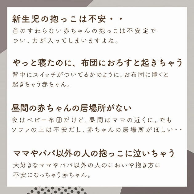 適度な厚みとやわらかさの抱っこふとんはフィット感や安定感に優れ、誰でも抱っこしやすくなる便利アイテムです。 0〜4ケ月頃までご使用いただけます。ねんねした赤ちゃんの「背中スイッチ」を押しにくくなり、寝かせたまま部屋を移動するのも楽になります。汚れた時は丸洗い出来るのでいつでも清潔にお使いいただけます。 赤ちゃんが触れる表生地には綿100%の接結を使用。 柔らかな素材は、肌への刺激が少なく、デリケートな赤ちゃんに最適です。