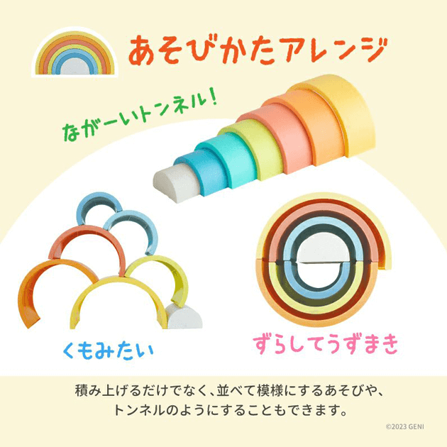 トンネルのように並べたり、バランスをとりながら積み上げたり、あそびのアレンジが楽しめます。