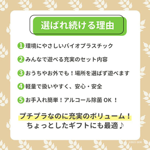・プラスチック素材の一部に「小麦の茎」を全体の20%配合することで、プラスチックの使用量を軽減しています。一般的な艶のあるプラスチック素材と異なり、おもちゃの表面に素材特有のつぶつぶ模様が見られ、ナチュラルな素材感を演出しています。手触りはマットでさらっとした質感。高級感があり、小さなキズも目立ちにくい仕様です。