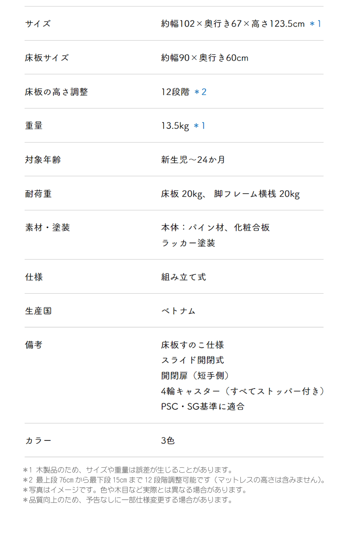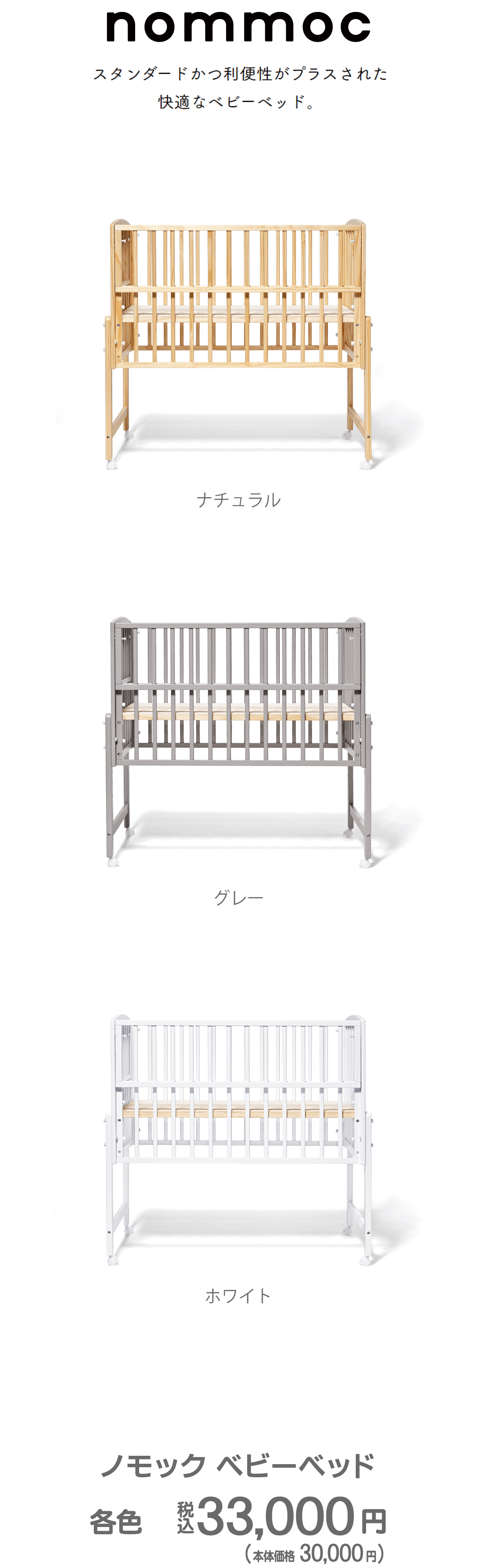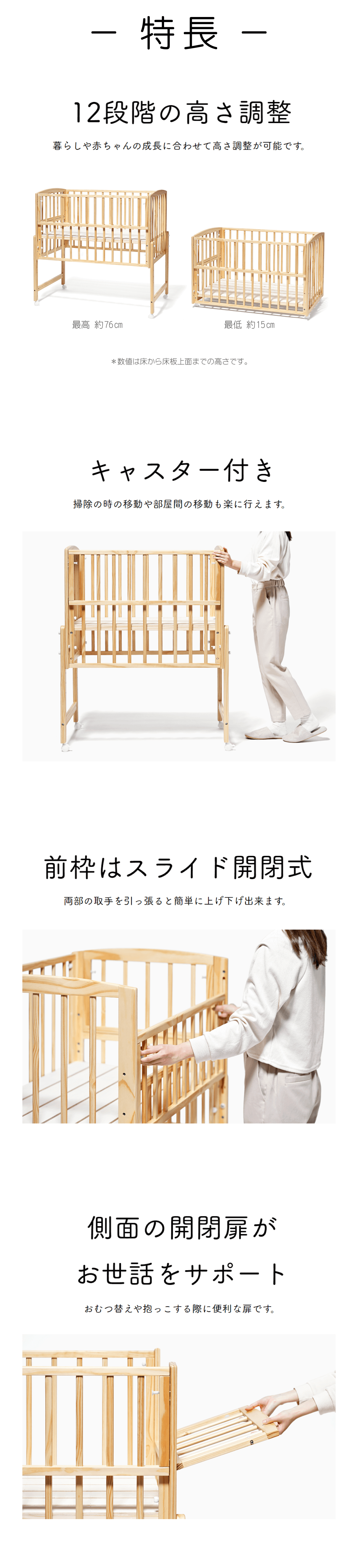 確かな安全性を持つレギュラーサイズのベビーベッドです。