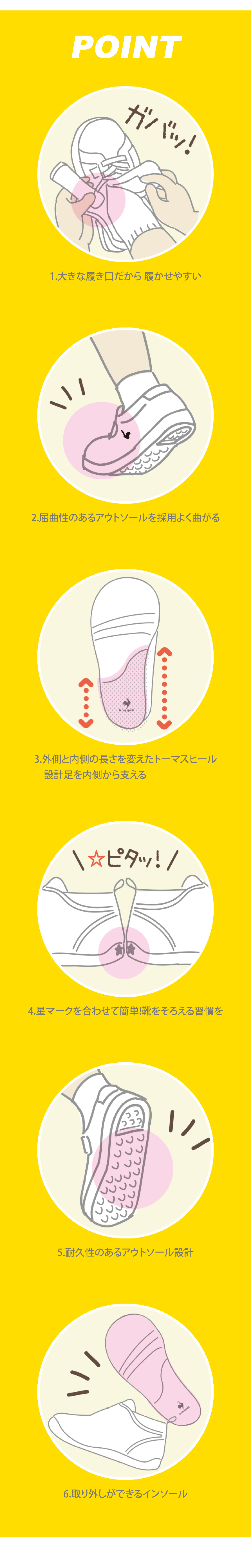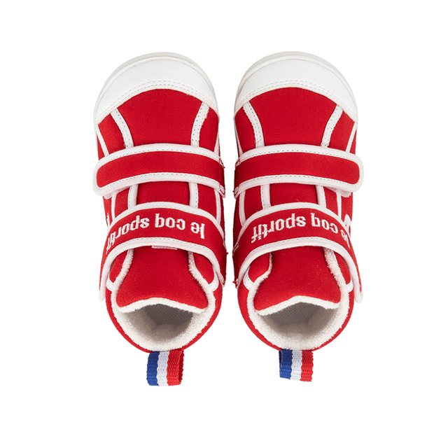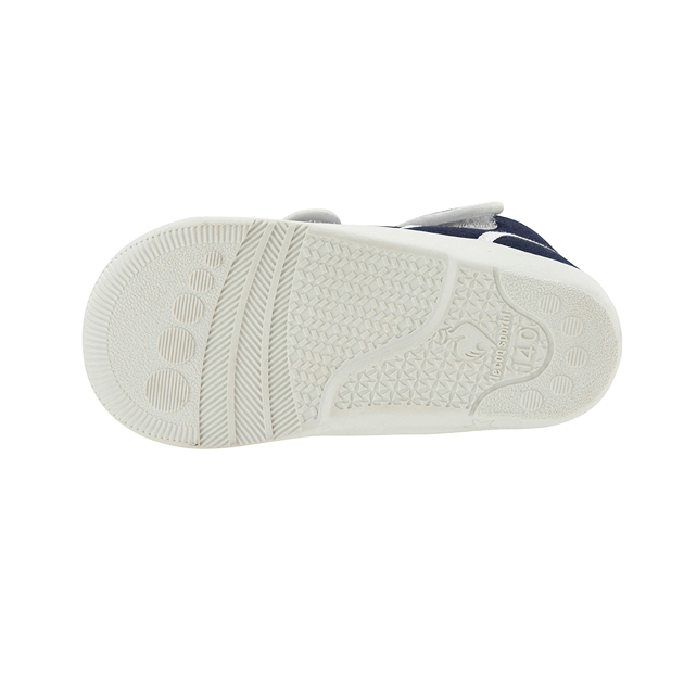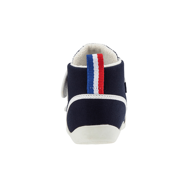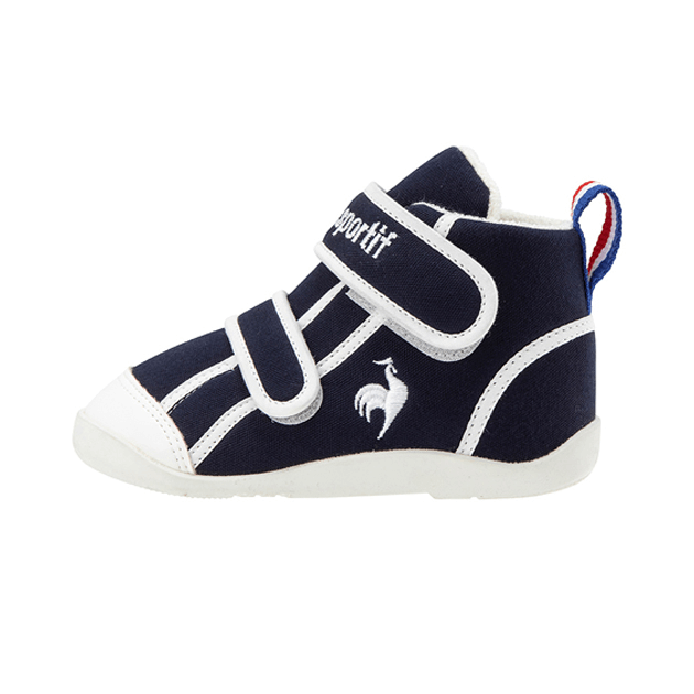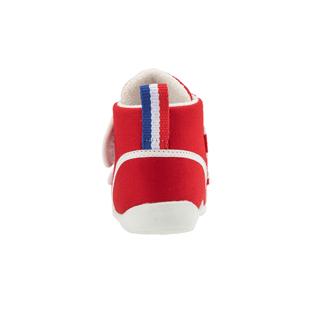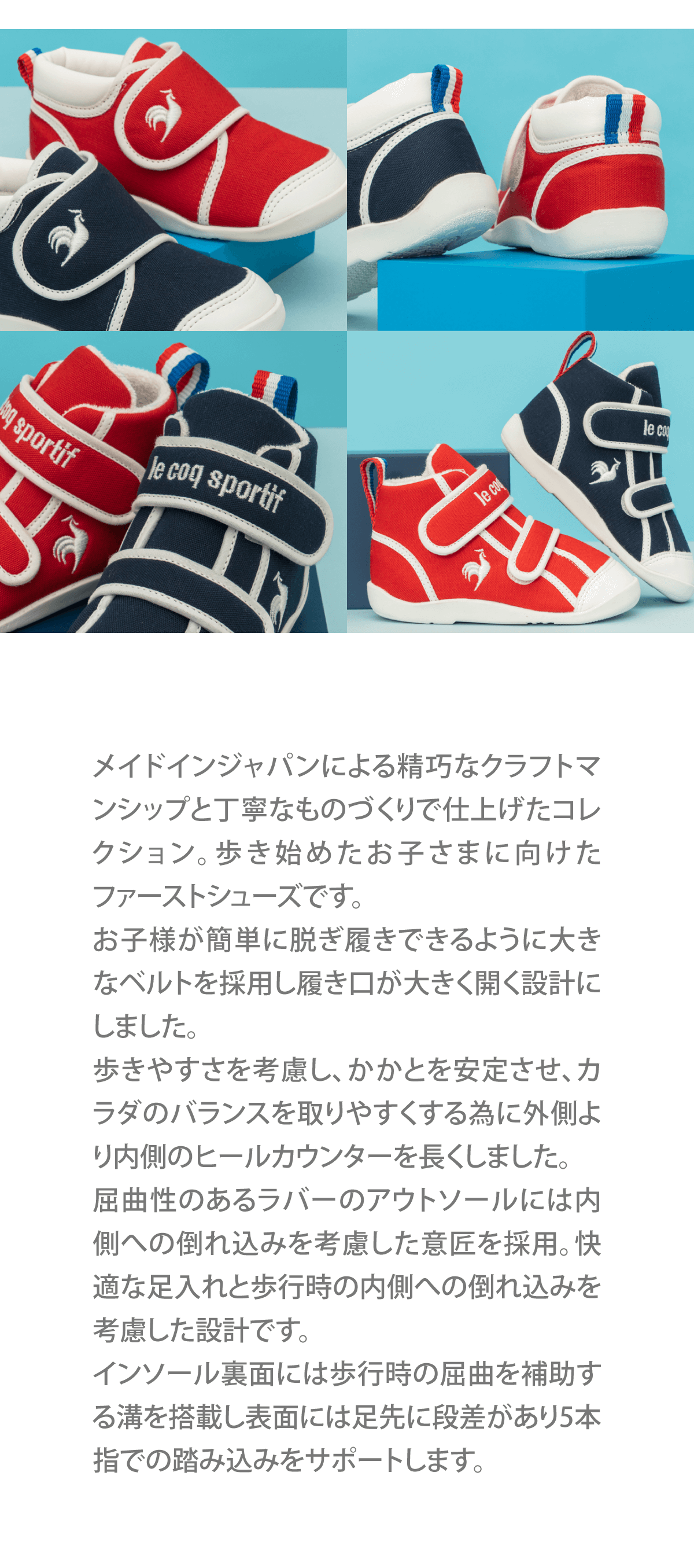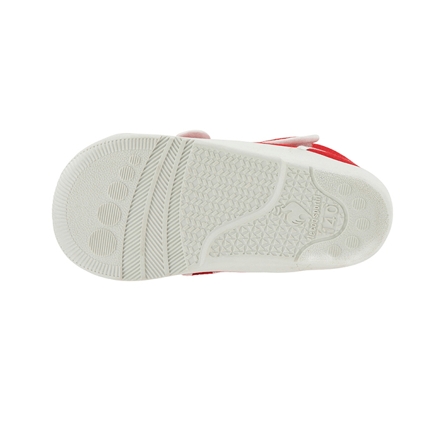 歩き始めたお子さまに向けたファーストシューズです。アッパーには2本のベルトを採用する事でフィット感を高めるように設計しました。