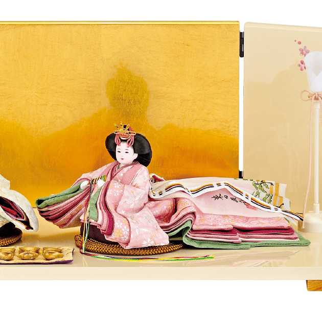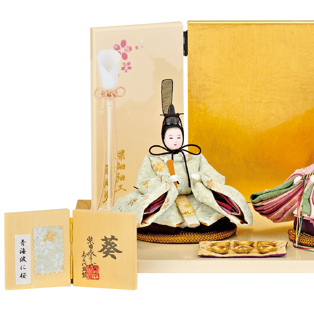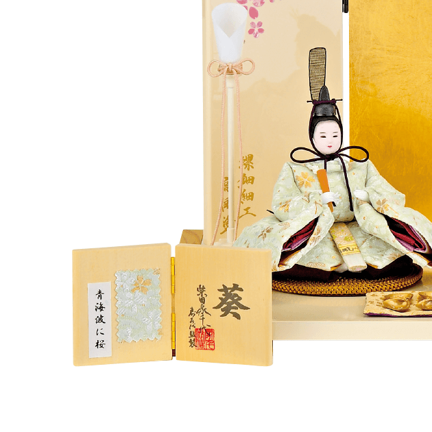 吉祥柄の青海波に桜を散りばめた金襴の織物を使ったお雛様です。黄金色に輝く生地に桜が映える華やかな一品です。