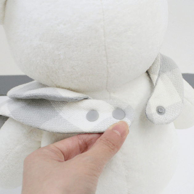 スナップボタンが2個ついているので首周りの成長に合わせて調整でき、パチンと簡単に着脱できます。