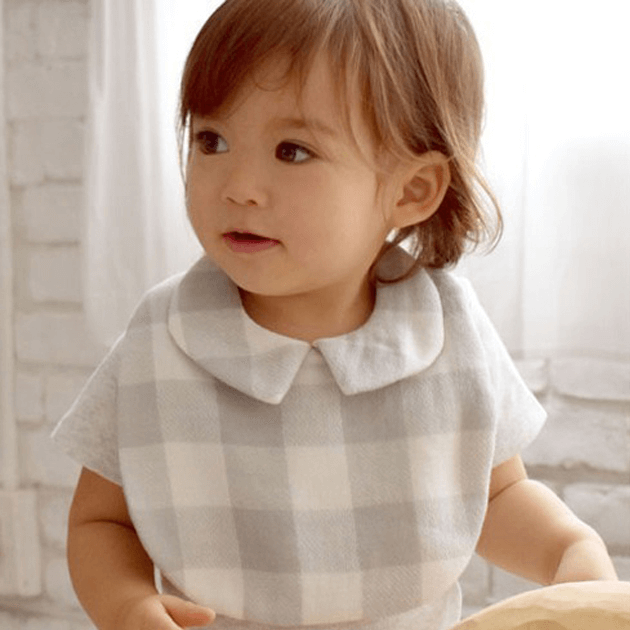 襟のついた丸いフォルムに、上品なブロックチェックがとってもお洒落♪ デイリーづかいはもちろん記念撮影や結婚式など、特別な日に着けたくなる可愛さです。 何かと写真を撮る機会の多い赤ちゃんには、1枚あるととっても便利。