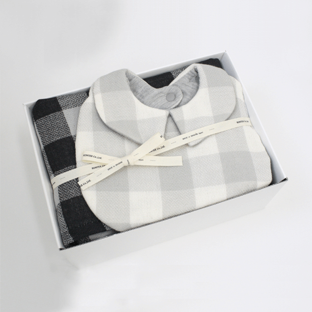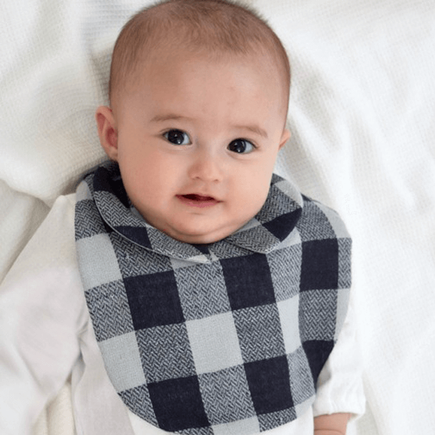 レトロモダンなブロックチェックに小さな襟がかわいい「おめかしスタイ」です。 オーガニックコットン100%のガーゼを両面に使用しているので、敏感なお肌にも安心。