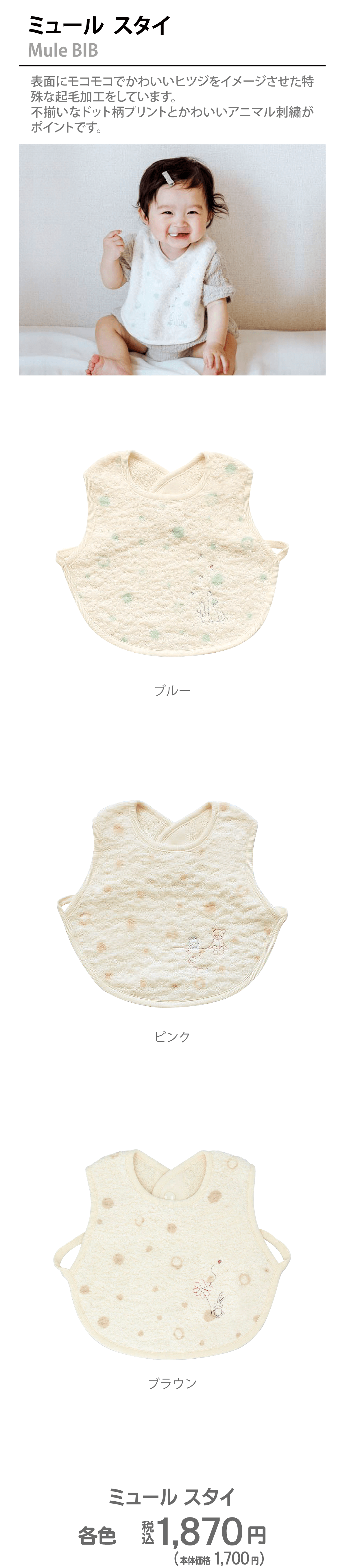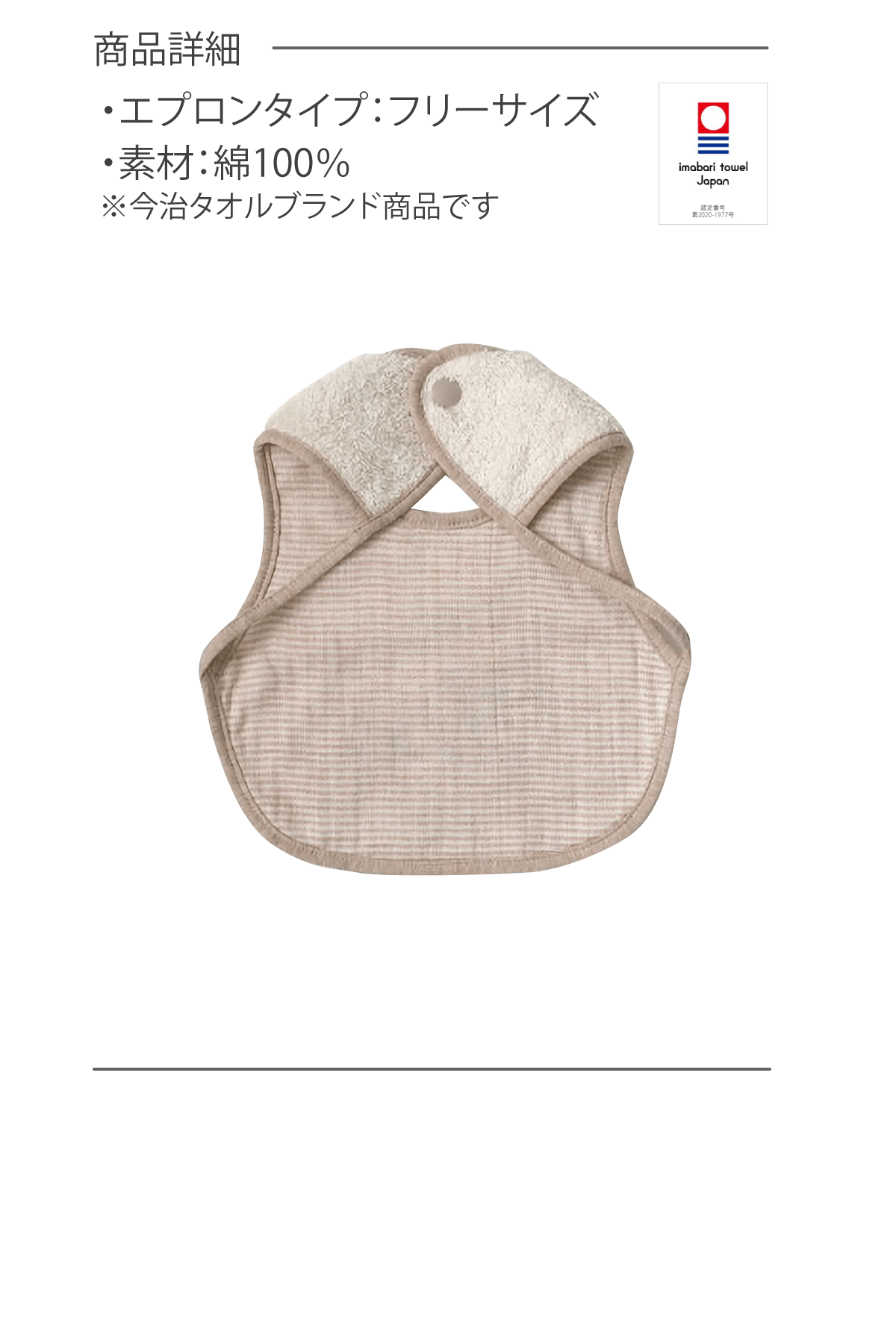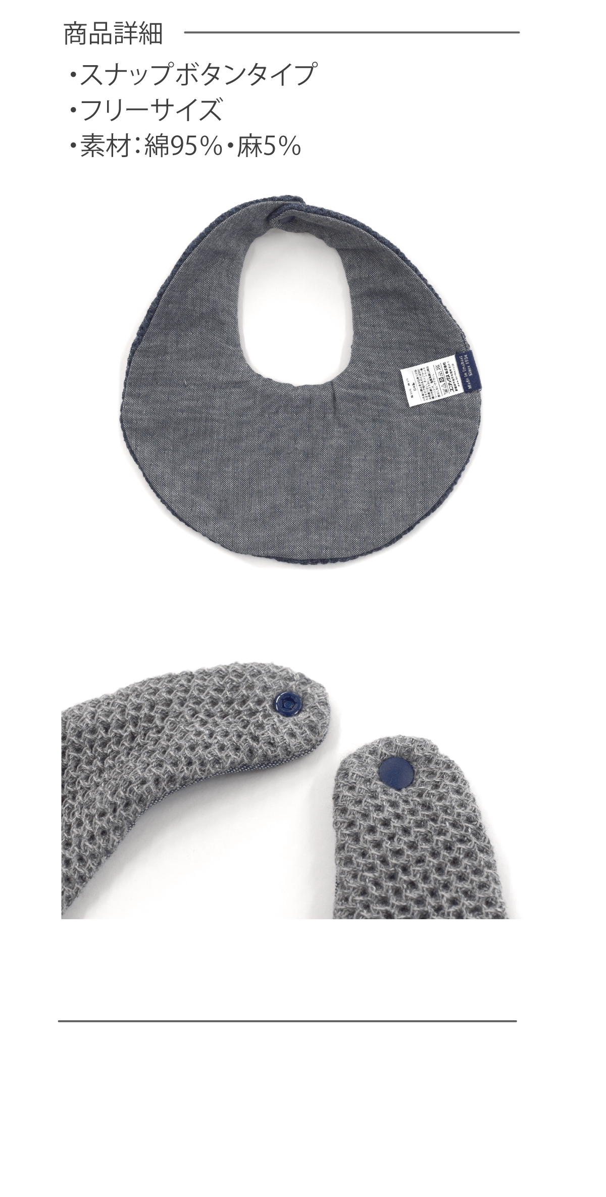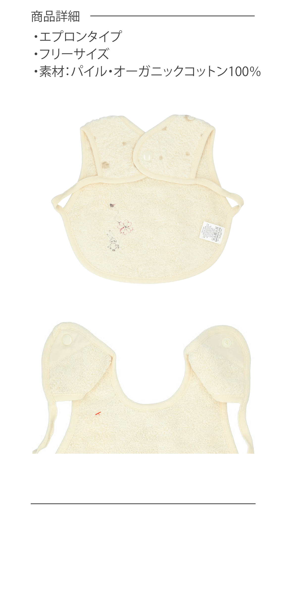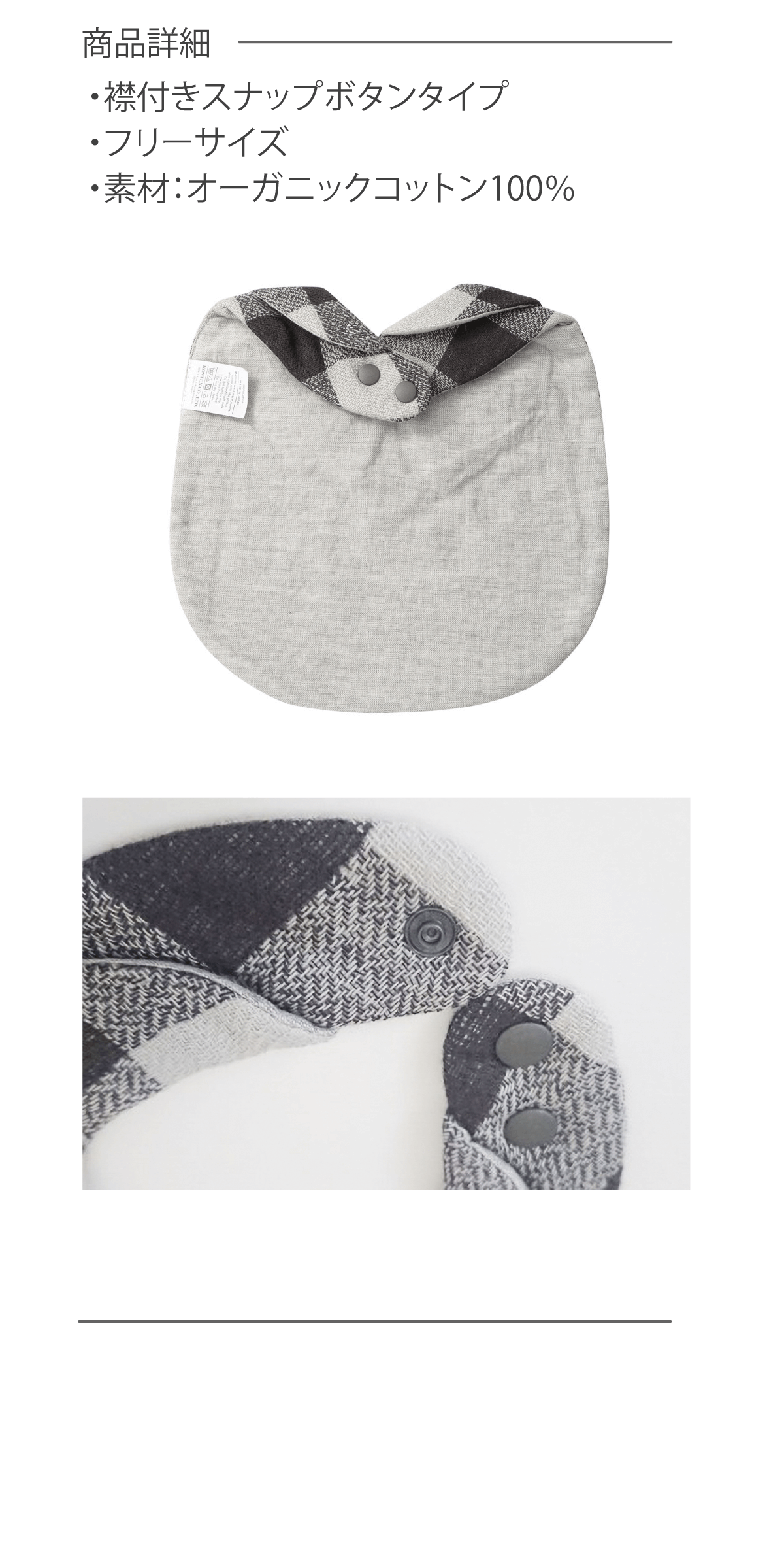 繊細なベビーの肌にもやさしいオーガニックコットンを両面に使用。 裏面は、グレーのガーゼ地。ふっくらとソフトな肌ざわりです。 襟部分が2重になっているので、お洋服を汚れからうまくカバーできます。 お洗濯をしてもしわになりにくく、型崩れもしないので気兼ねなく使っていただけます。
