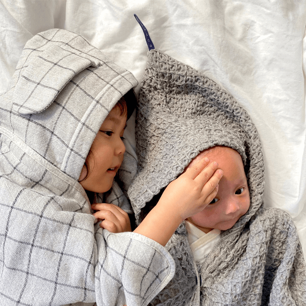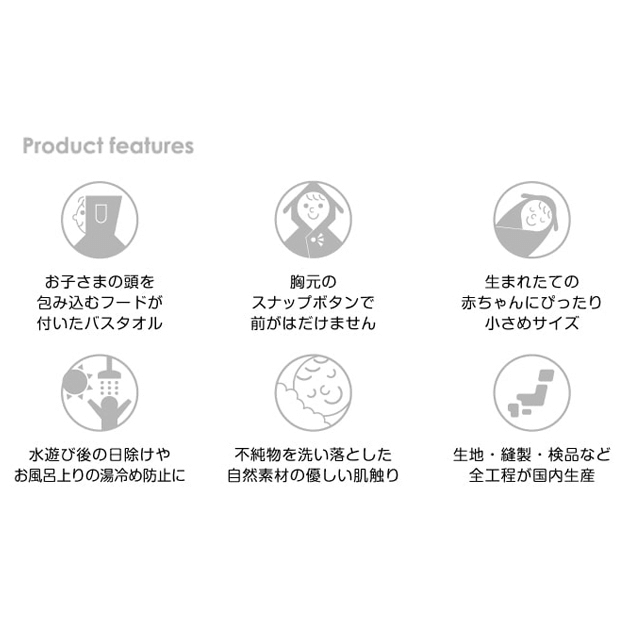お風呂上りに湯冷めしないように頭からすっぽりと被れるフード付なので、 お子さまを手早くお世話できるとても便利なアイテムです。 また、プールや水遊びなどの日除けにもお使いいただけます。