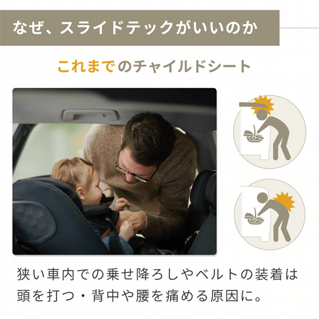 世界初の新技術「SLIDE TECH」によって、これまでに約90%※もの家族が抱えていた「乗せ降ろしの問題」を解決します。