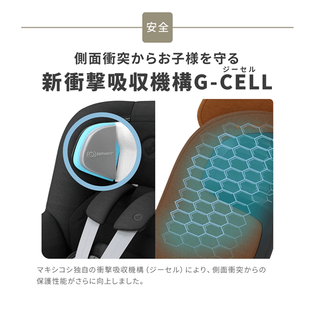 お子様の頭部を側面衝突から保護する独自の特許技術。
