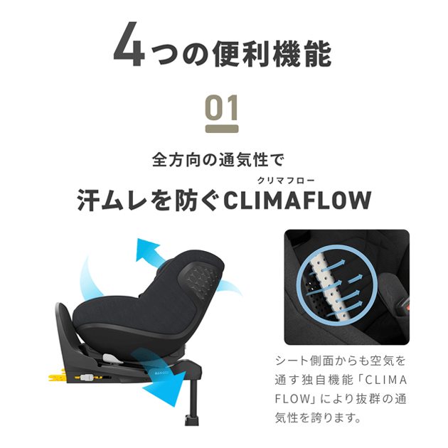 シート背面に空気の循環を促進して、常に適温なシート環境を提供するマキシコシの独自技術。