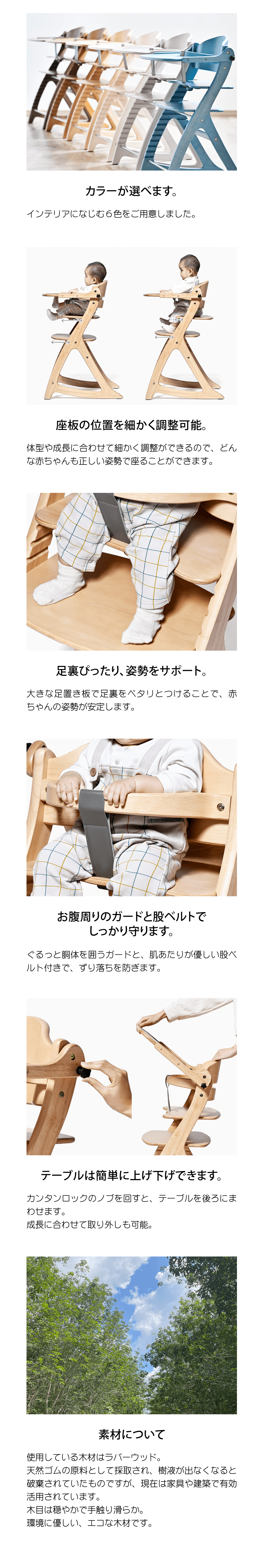 体型や成長に合わせて細かく調整ができるので、 どんな赤ちゃんも正しい姿勢で座ることができます。