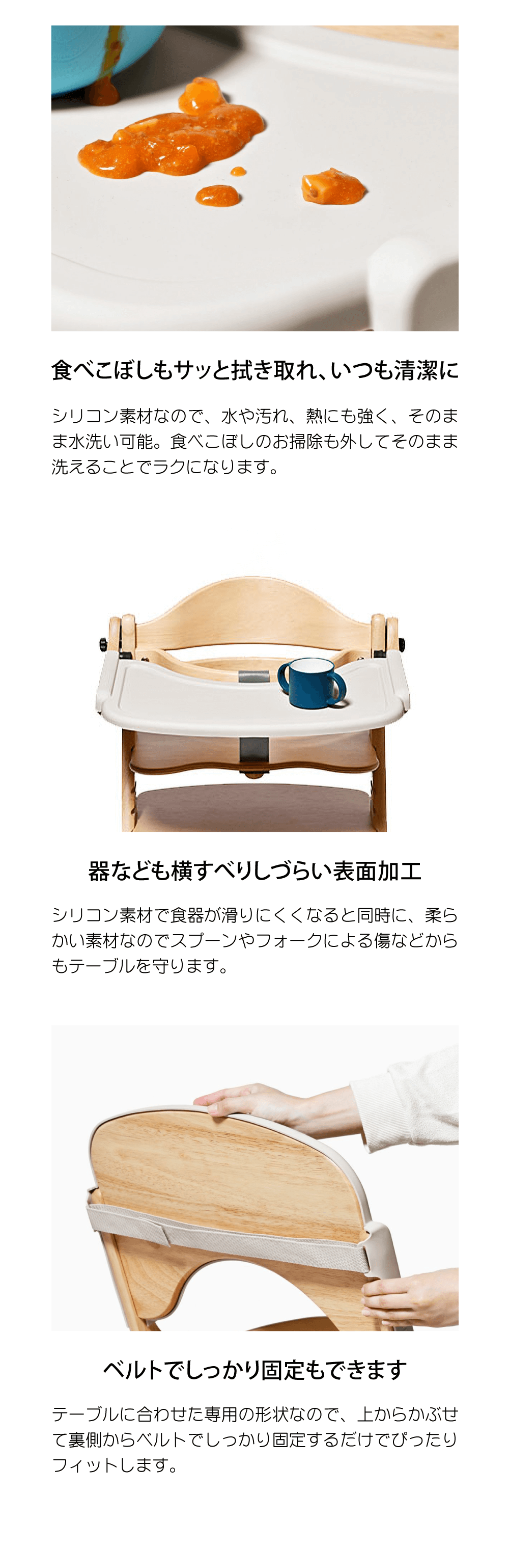 「すくすくチェアGL」にフィットする、シリコン製カバー・食べこぼしもサッと拭き取れ、いつも清潔に・器なども横すべりしづらい表面加工・ベルトでしっかり固定もできます・テーブルをキズから保護します●サイズ・サイズ 約幅50.4×奥行き30.3×高さ5cm・本体重量 約295g・梱包重量 約500g・素材 カバー:シリコン 固定バンド:PP・生産国 中国・対応商品 すくすくチェア GL・備考 手洗い可能