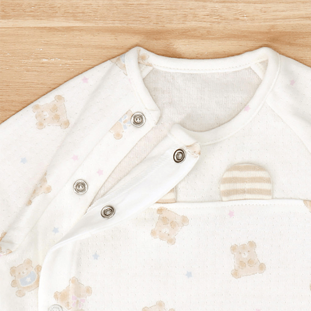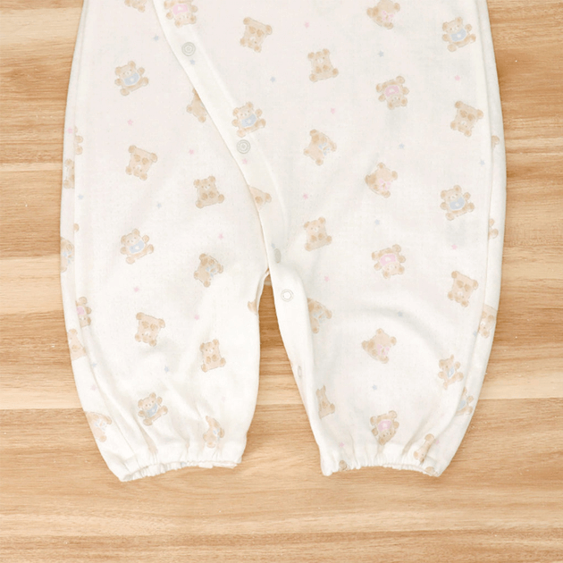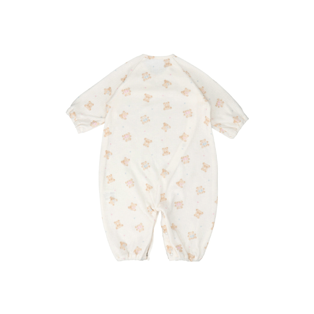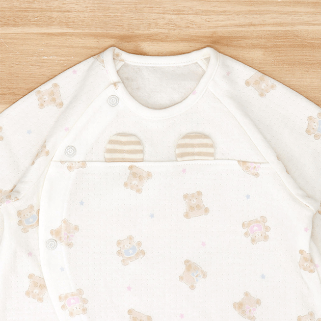 ちょこんと出たくまみみが可愛い優しい色合いのプリント柄のウェアです。