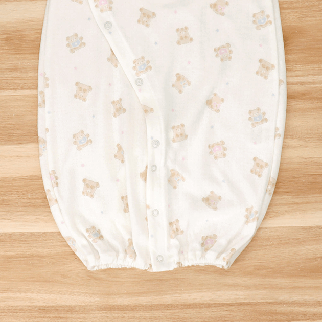 ふんわりした雰囲気が赤ちゃんによく似合います。やわらかく保温性のある接結素材で、秋から春先まで活躍します。生まれてすぐは足を包むドレスタイプ。足をばたばた出来るようになったらボタンを留め替えて、カバーオールタイプにもなるツーウェイ仕様です。