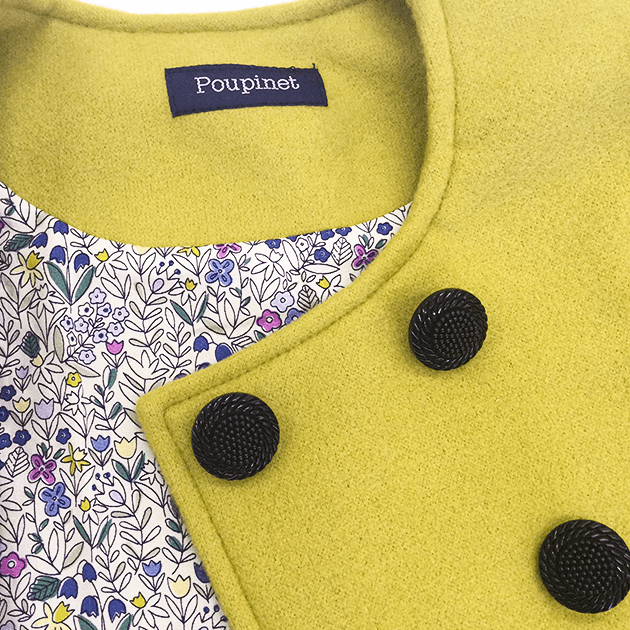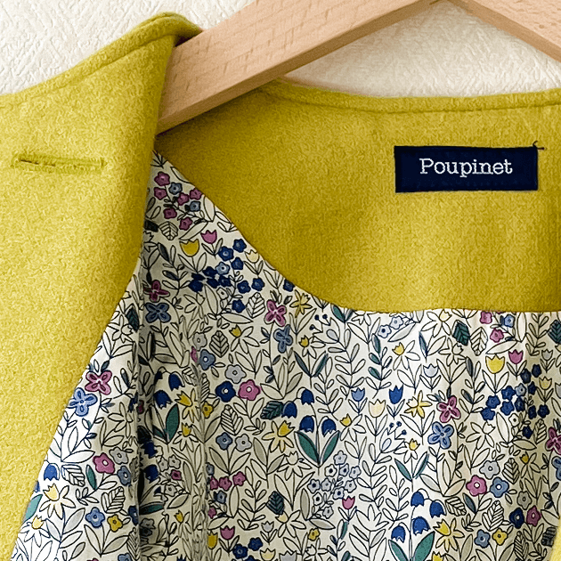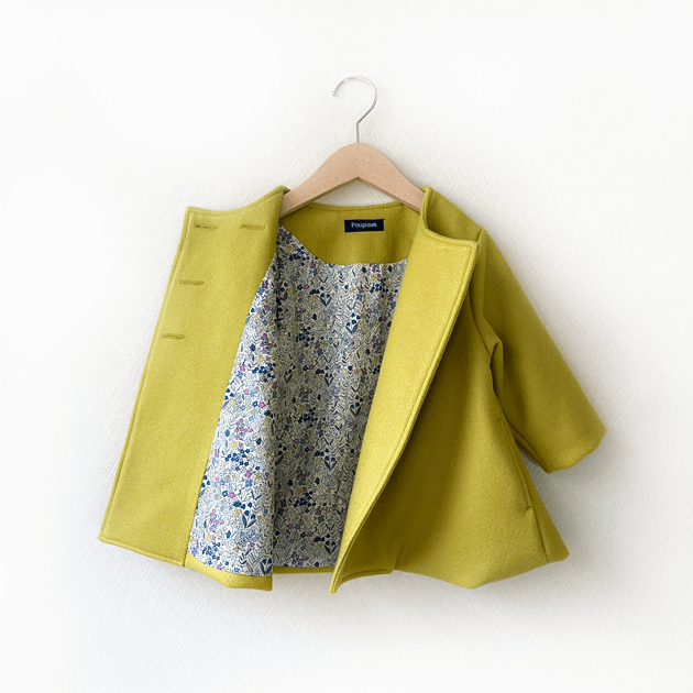 マフラーなどの巻き物も楽しめたり、ボタンの開け方で大きな衿のような着こなしを楽しむことができるコートです。