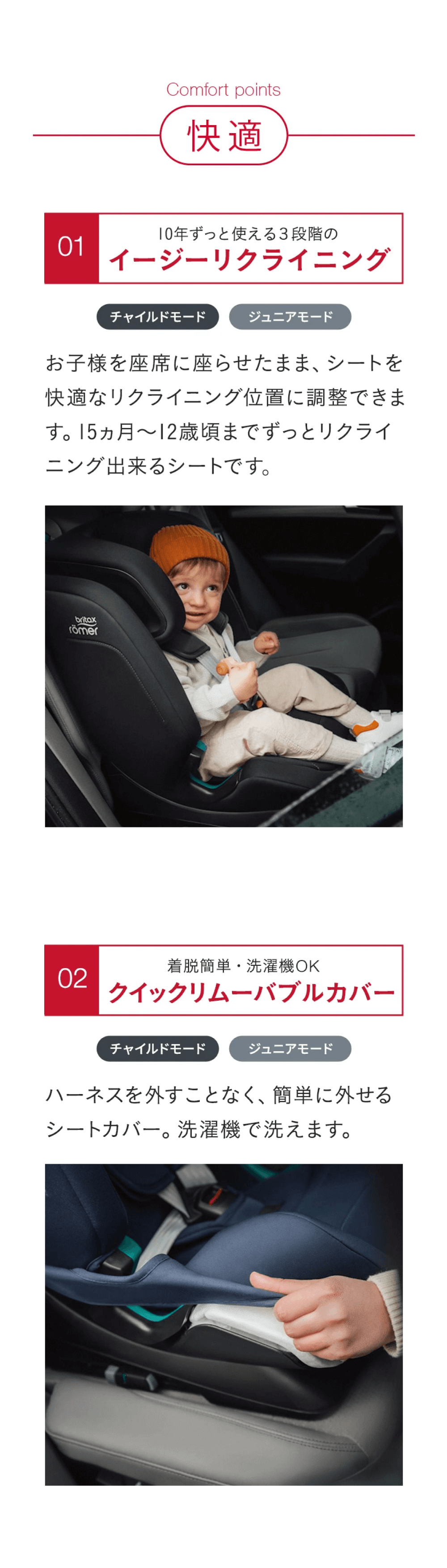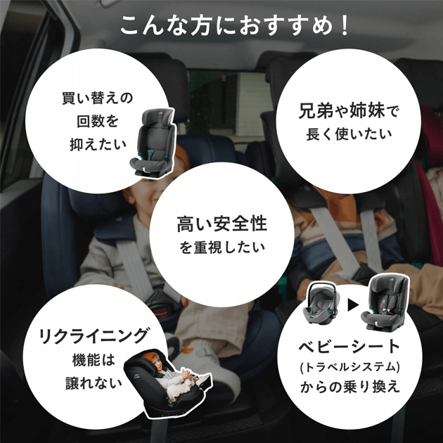 EVOLVAFIXは、幼児期からチャイルドシートを卒業するまでの長い期間、最新の安全基準でお子様をしっかりと守ります。