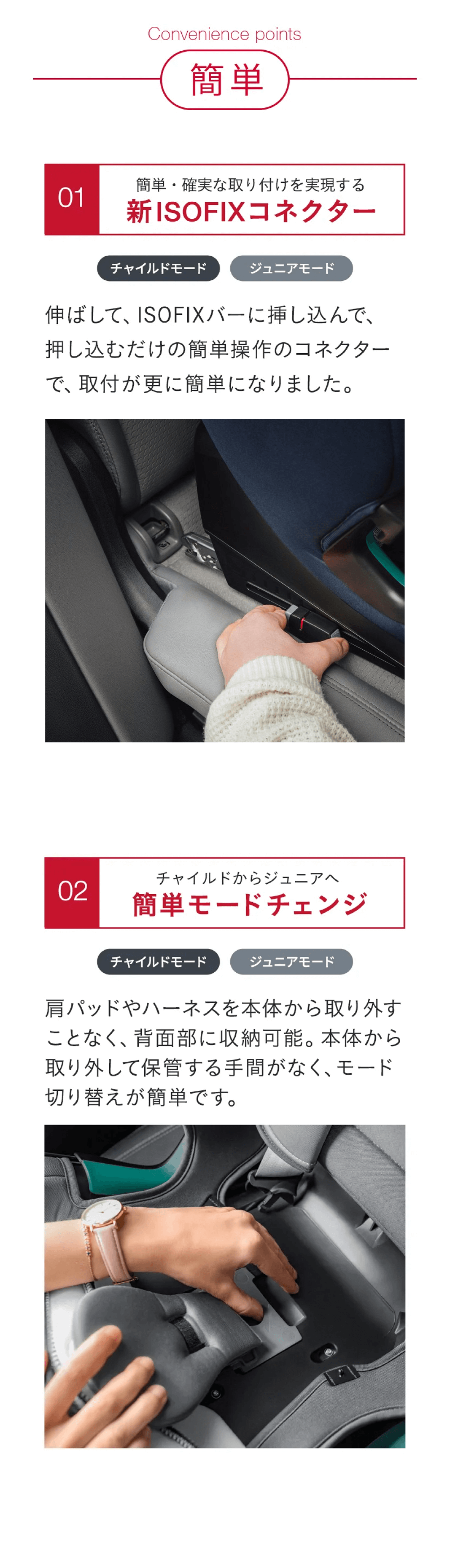 FLIP&GROW(フリップ&グロウ)機能により、お子様の成長に応じて5点式ハーネス付きシートから車の3点式シートベルトによるハイバックブースターシートに簡単に切り替えることができます。 また、シートからパーツを取り外す必要がないため、いつでも元に戻すことができます。
