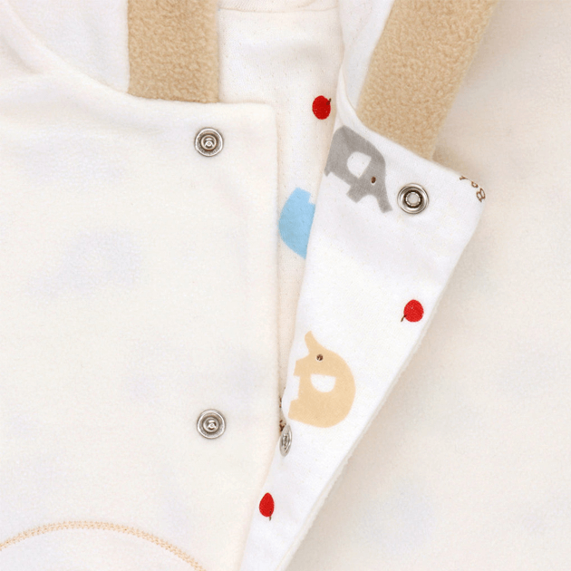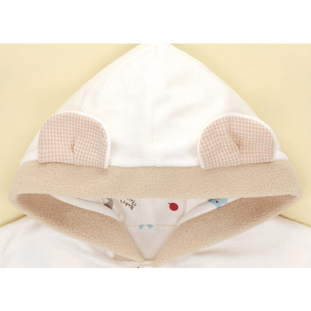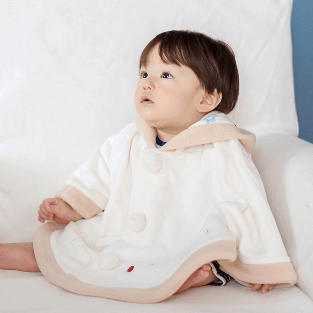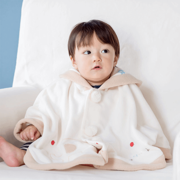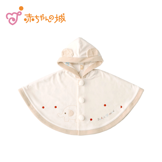 あんしんの日本製ベビー用品ブランド「赤ちゃんの城」。製品の全てを日本で企画製造し、生まれたての小さな命を安心の品質でつつみます。大きなぞうさんの刺繍と耳付きフードがとってもキュートなマントです。 やわらかくて軽いフリース素材で普段使いにもぴったり。さっと羽織れるマントは冬に人気の防寒アイテムです。 裾のボタンを留めると袖口になり手を出すこともできます。 ■配色 アイボリー■素材 表:ポリエステル100%(フリース)、 裏:綿100%(接結)■サイズ・寸法 60~90cm