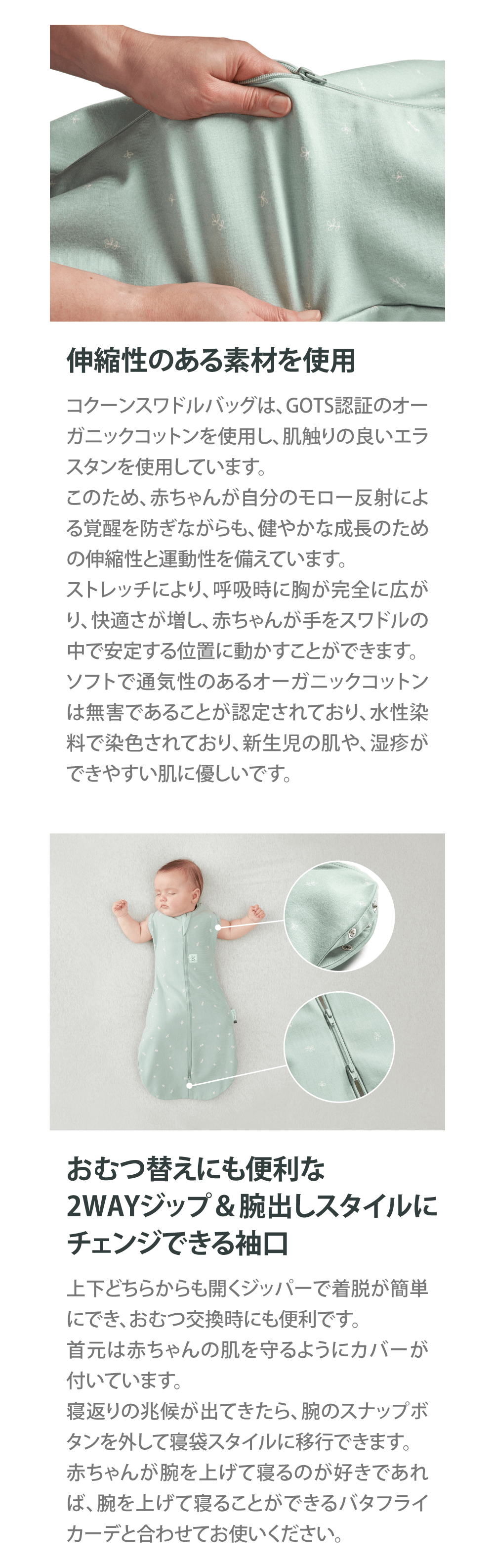 スワドルとおくるみは、どちらも赤ちゃんを包む布のことを指します。おくるみは英語で「Swaddle(スワドル)」と表記するので名前が違うだけで同じものと思う方も多いでしょう。 実際、日本では服のように着せるタイプを「スワドル」、一枚の布で作られた巻くタイプを「おくるみ」と呼ぶ傾向にあります。 スワドルとおくるみは「赤ちゃんを包む」という役割で見ると同じなのですが、エルゴポーチのコクーンスワドルバッグと一般的なおくるみとでは違いがあります。
