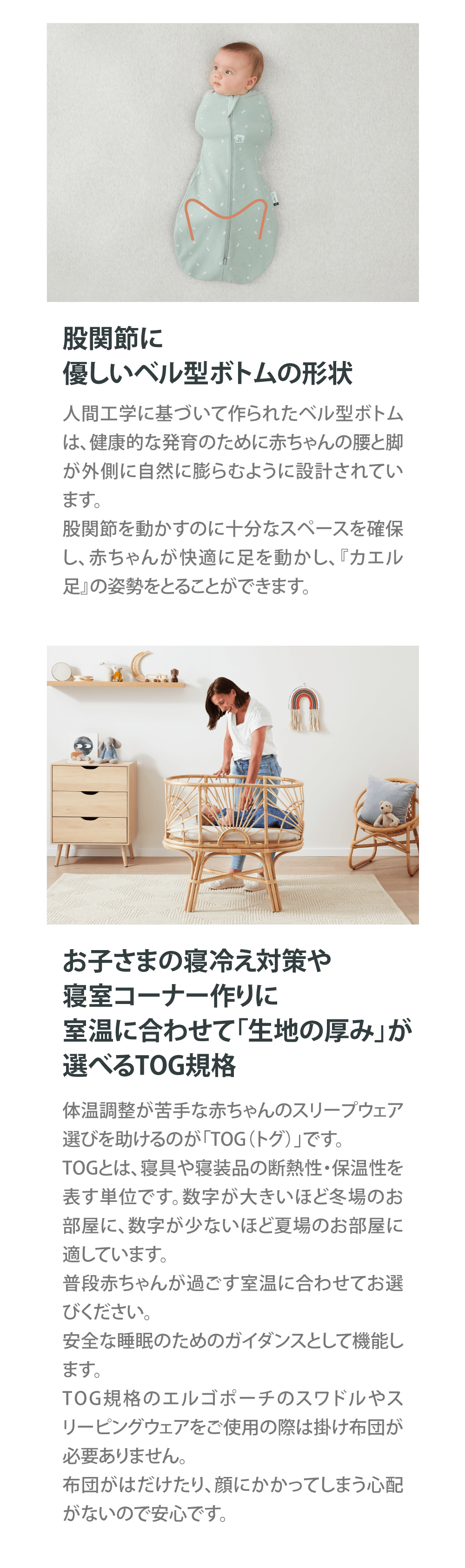 エルゴポーチのスリープウェアはすべてTOG規格に適合し、オーガニックで通気性の良い天然繊維を使用しているので、赤ちゃんの体温を一定に保ち、安全で快適な睡眠をもたらします。