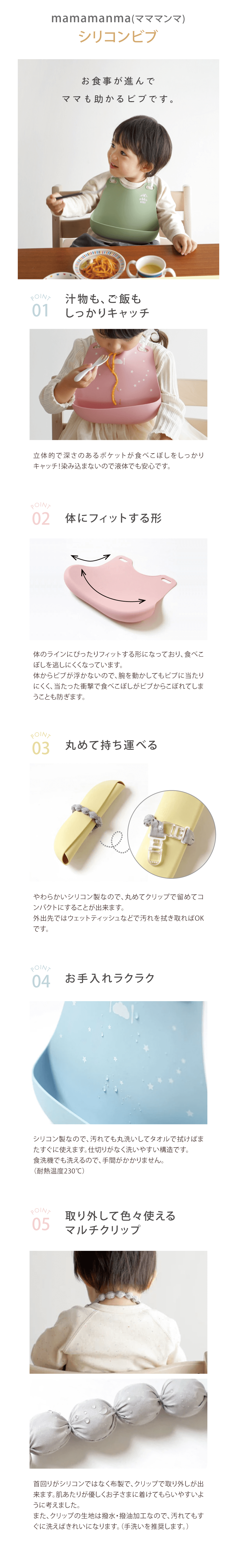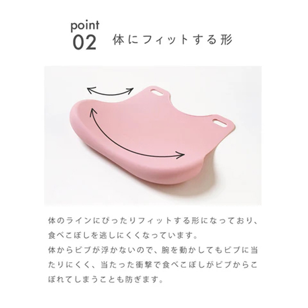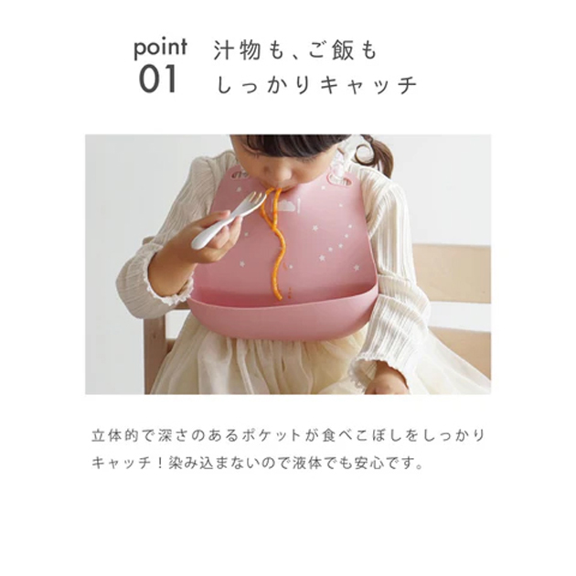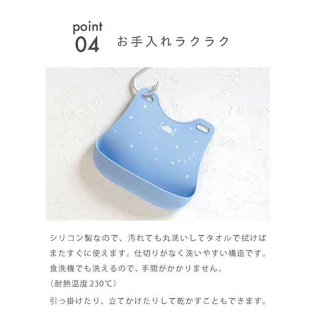 シリコーンのビブ本体部分は、食洗器でのお手入れもでき、毎日の繰り返しの使用にとても便利です。