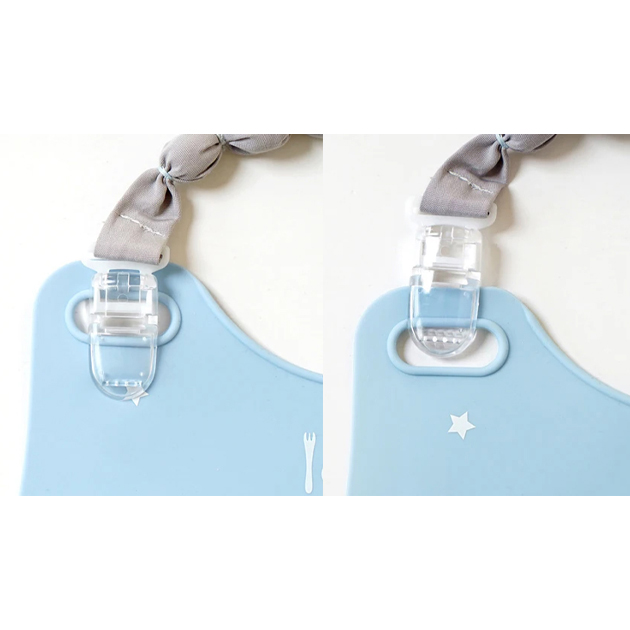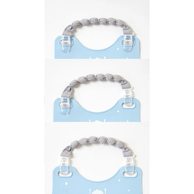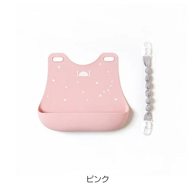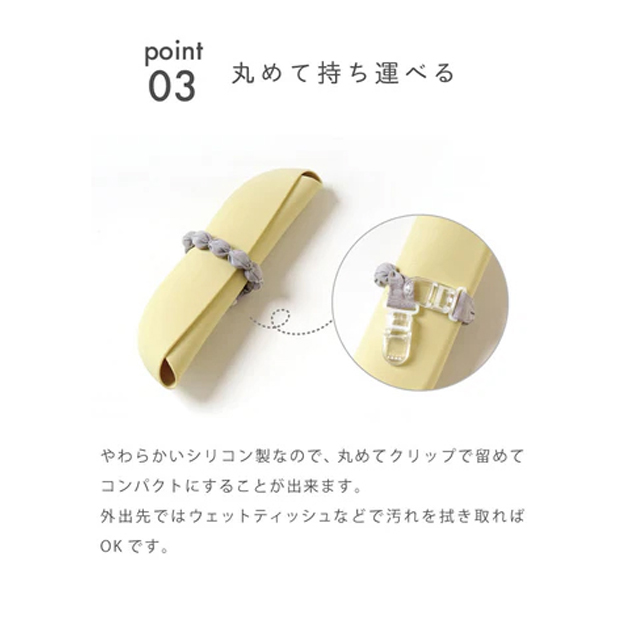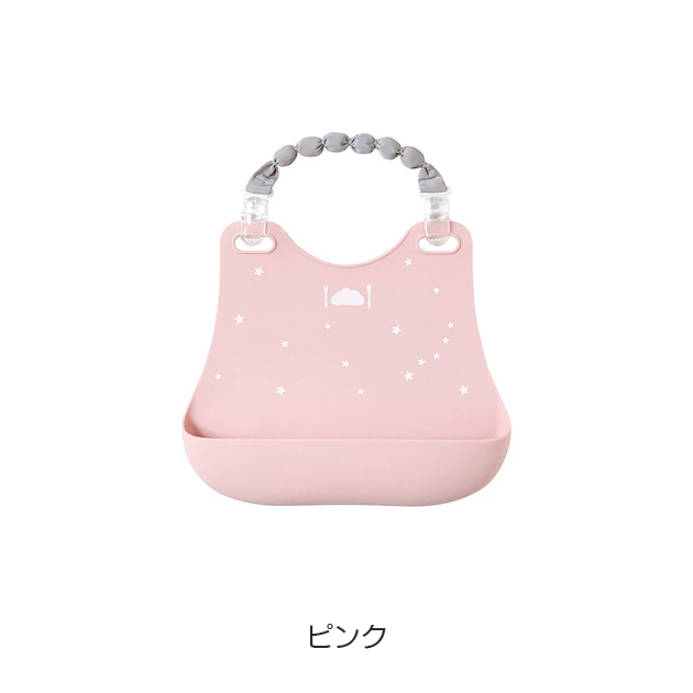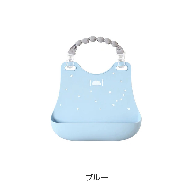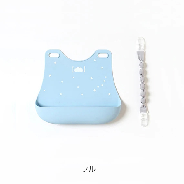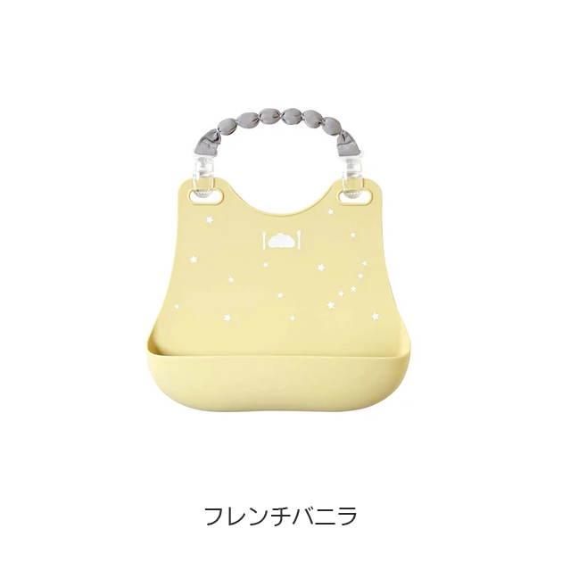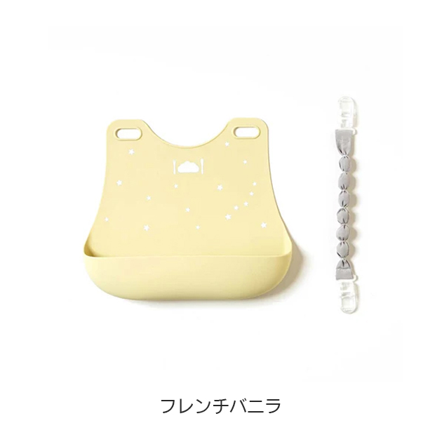 首周りのひもは布製マルチクリップ、エプロン部分はシリコーン製のセパレートタイプのお食事シリコンビブ。