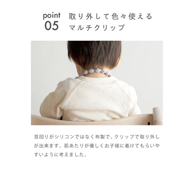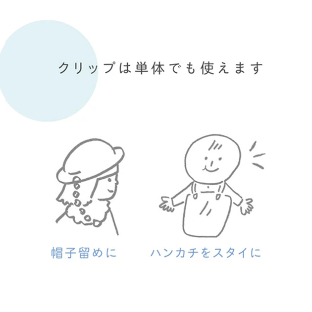 タオルやハンカチを留めてスタイにしたり、帽子などの落下防止やおしゃぶりホルダーなど、様々な用途で使えます。