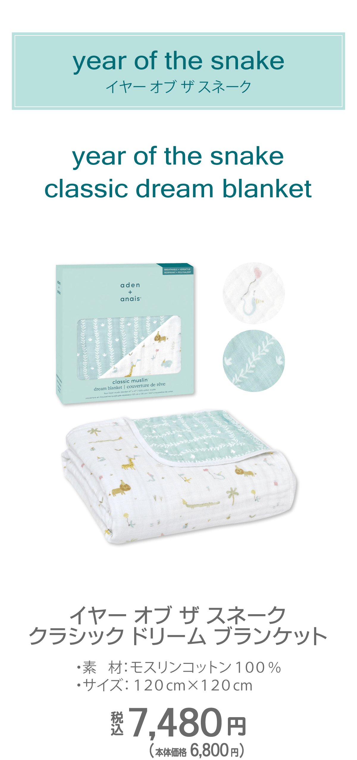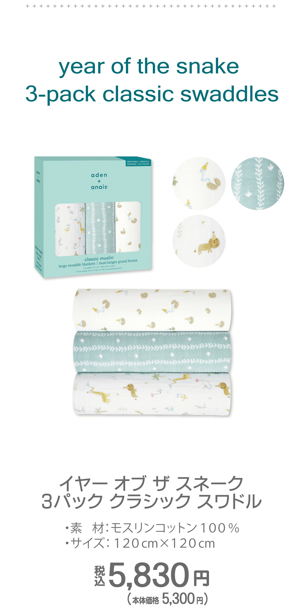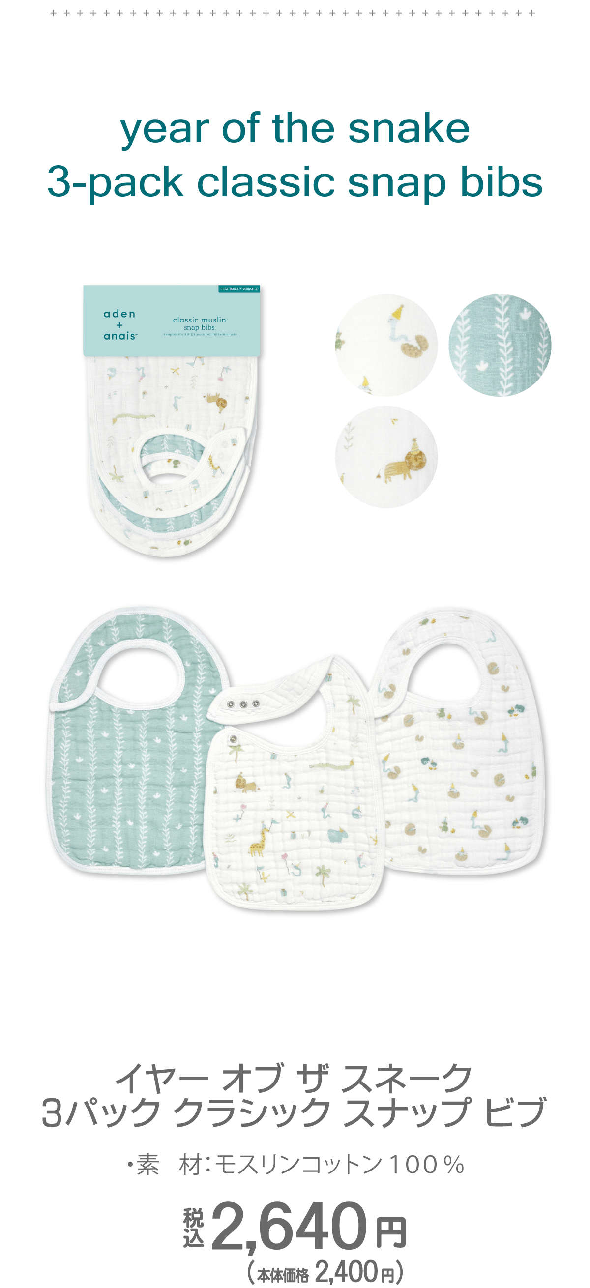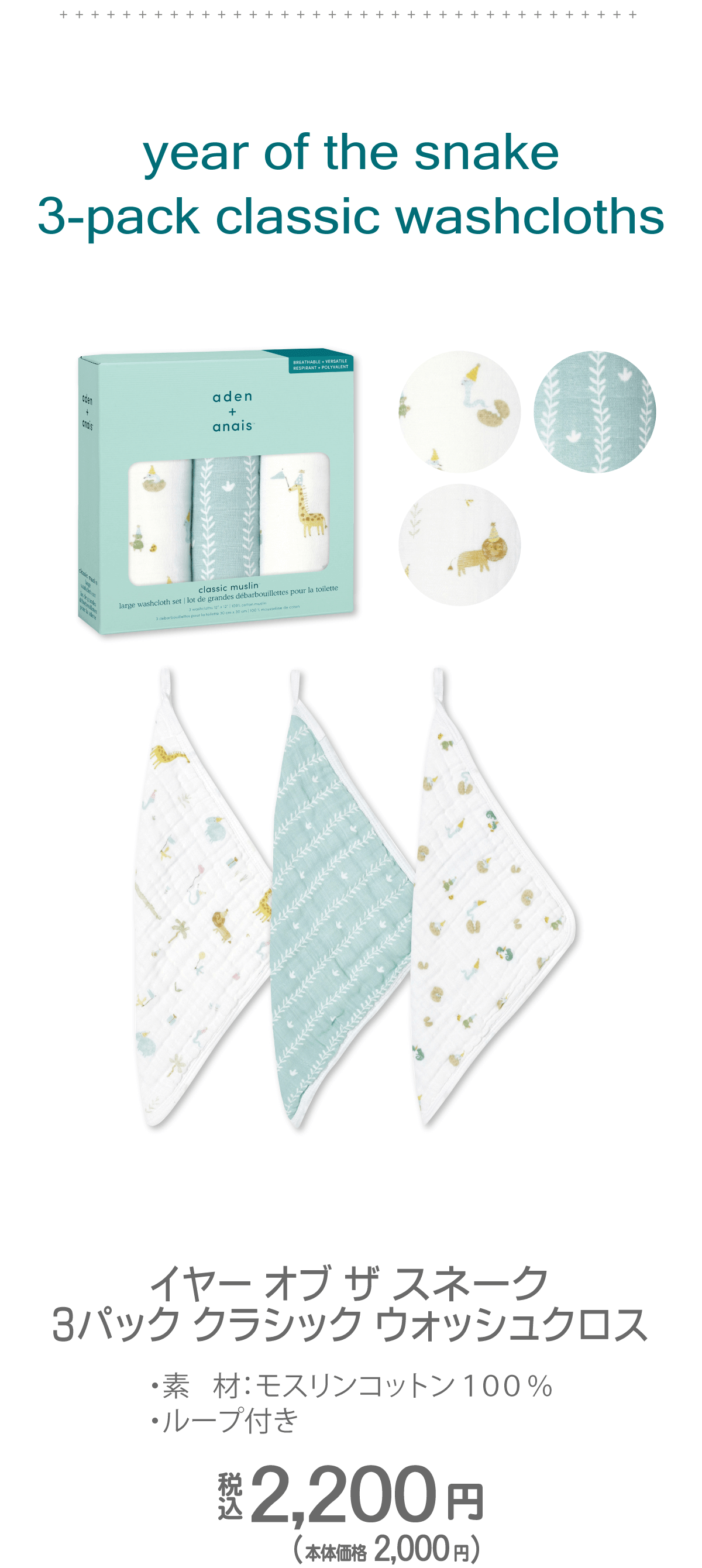 2025年の干支柄コレクションは、動物たちが楽しむ賑やかな「party」、草むらを表現した「vine」、そして生まれたばかりのベビーを描いた「just hatched」の 3つのデザインをご用意しました。 可愛らしい三角帽子をかぶったヘビや仲間たちが描かれたデザインは、性別を問わずギフトにも最適です。