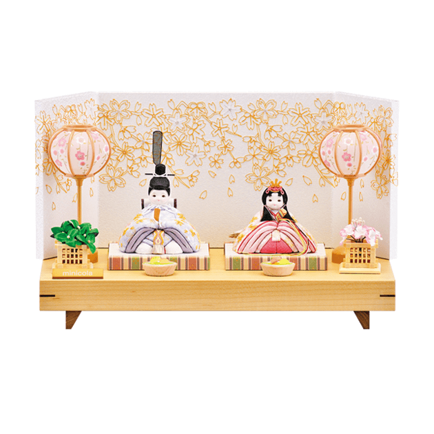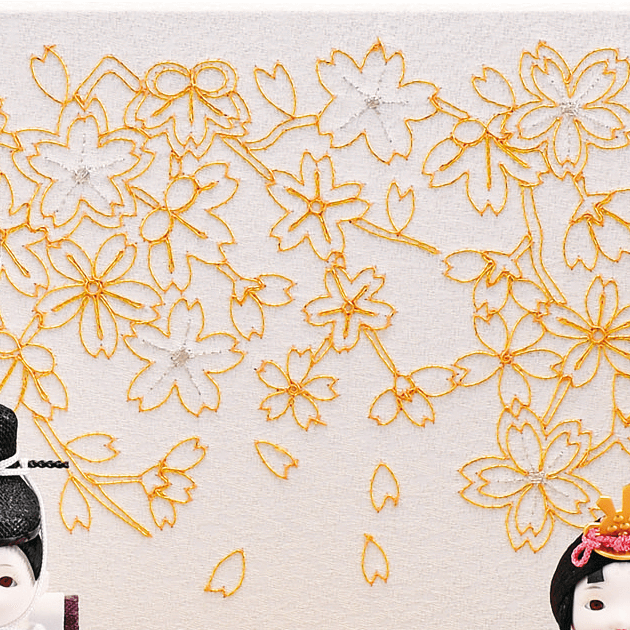 宝物を並べた縁起の良い宝尽くし模様を刺繍したお雛様です。金糸で桜を刺繍した屏風が華やかにお雛様を彩ります。