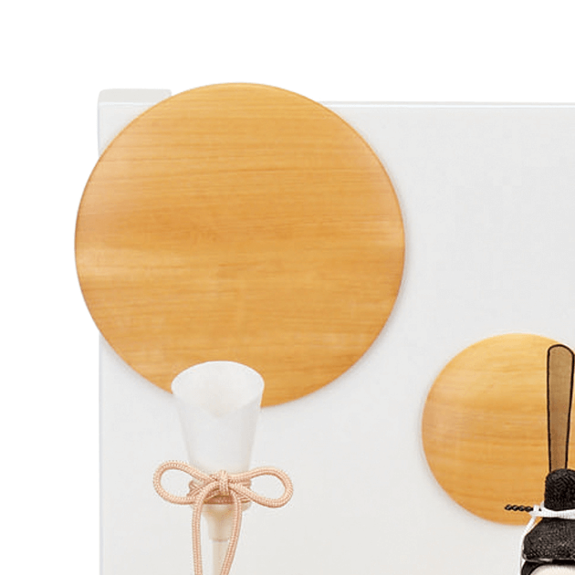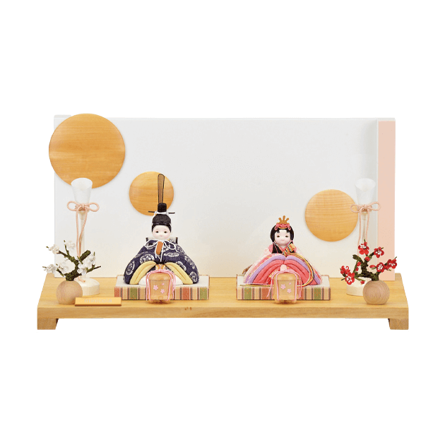 唐花紋模様のお雛様。ピンクがアクセントの高岡塗の屏風は、縁起がよいとされる丸い模様を、ナチュラルな木でデザインしました。