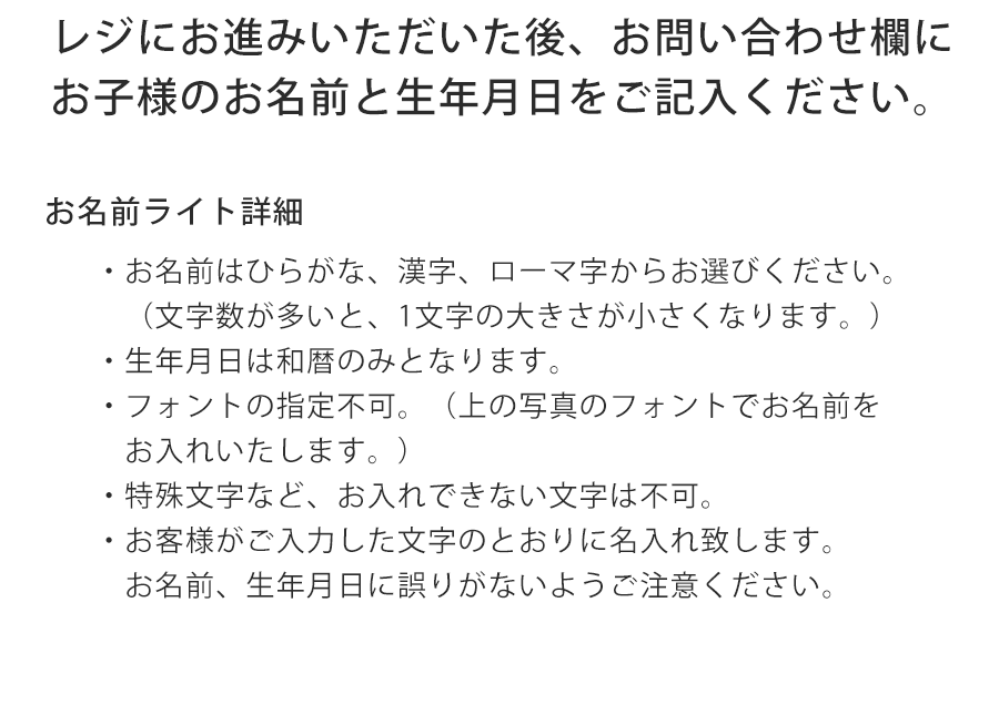 レジにお進みいただいた後、お問合せ欄にお子様のお名前と生年月日をご記入ください。