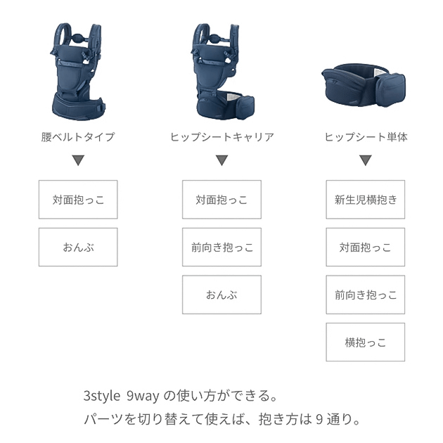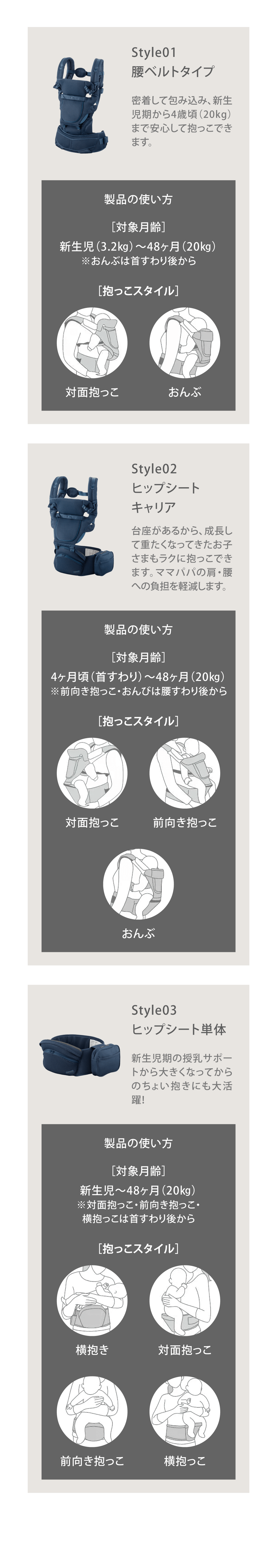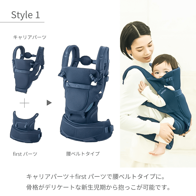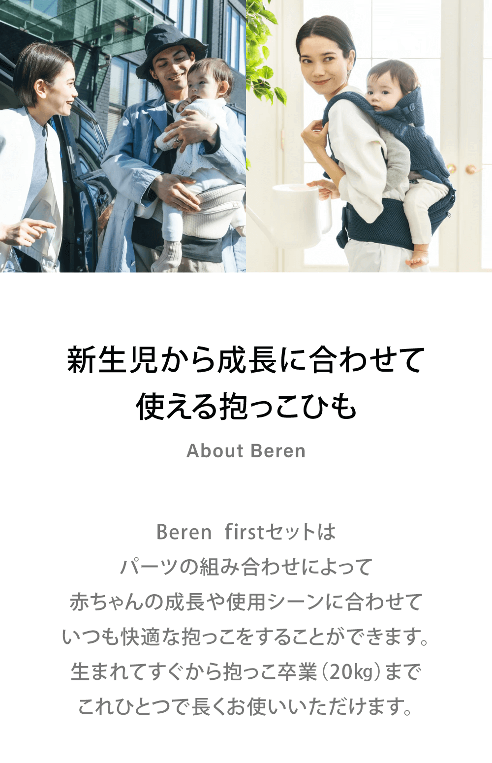 Beren firstセットは、3style 9wayで新生児期~抱っこ卒業 (20kg) までお使いいただけます。